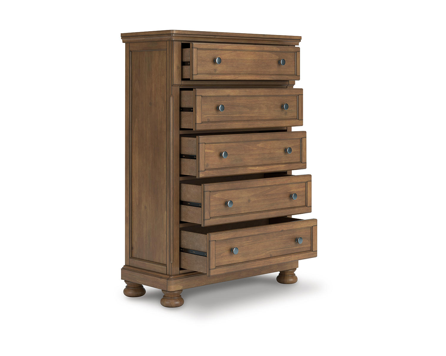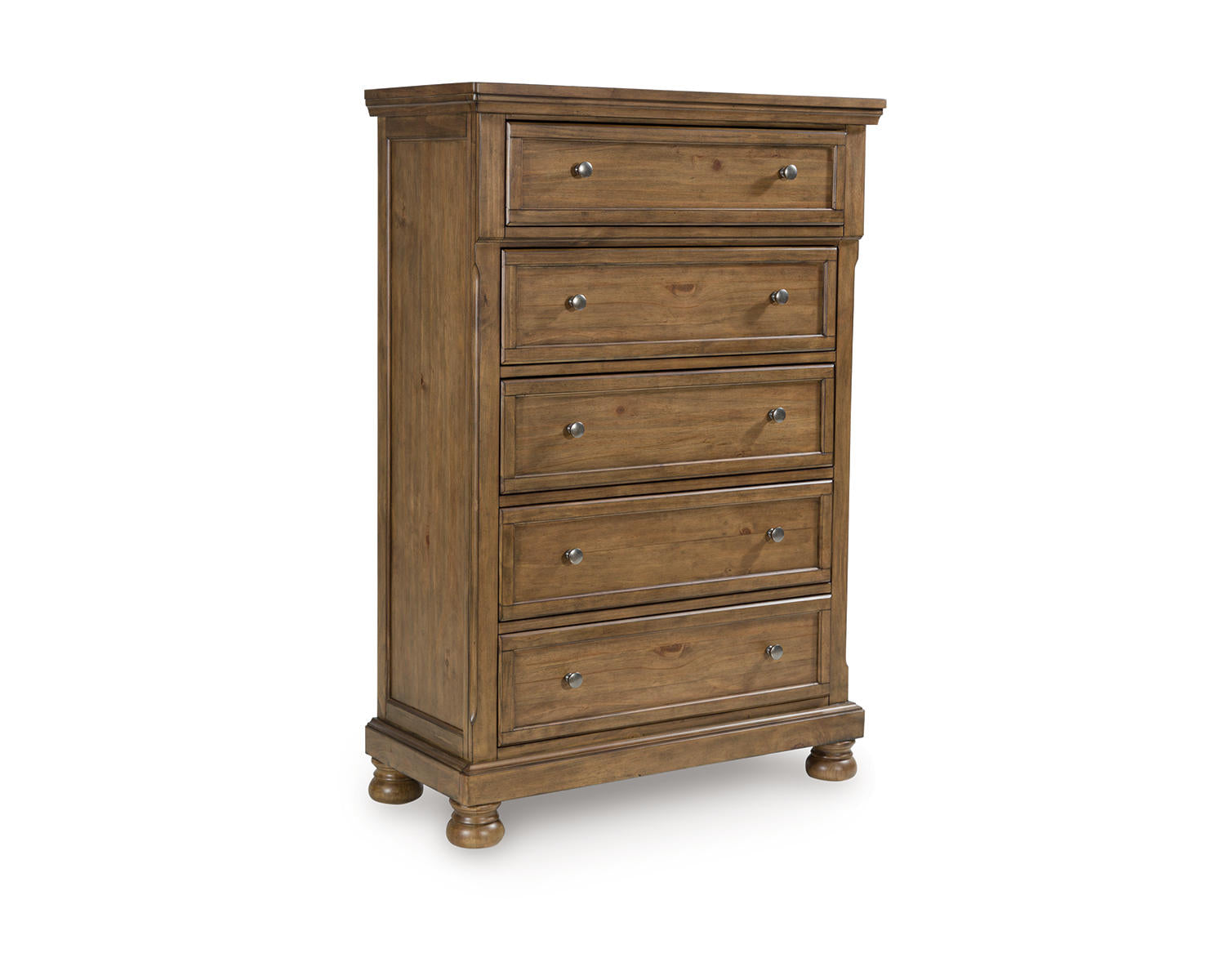 Meet the Feddinger Five Drawer Chest, a versatile storage solution designed for bedrooms that need organized space without clutter. This medium brown dresser combines practical storage with a timeless look that fits a variety of decors. Ideal for keeping shirts, sweaters, and personal items neatly tucked away, it brings order with style.