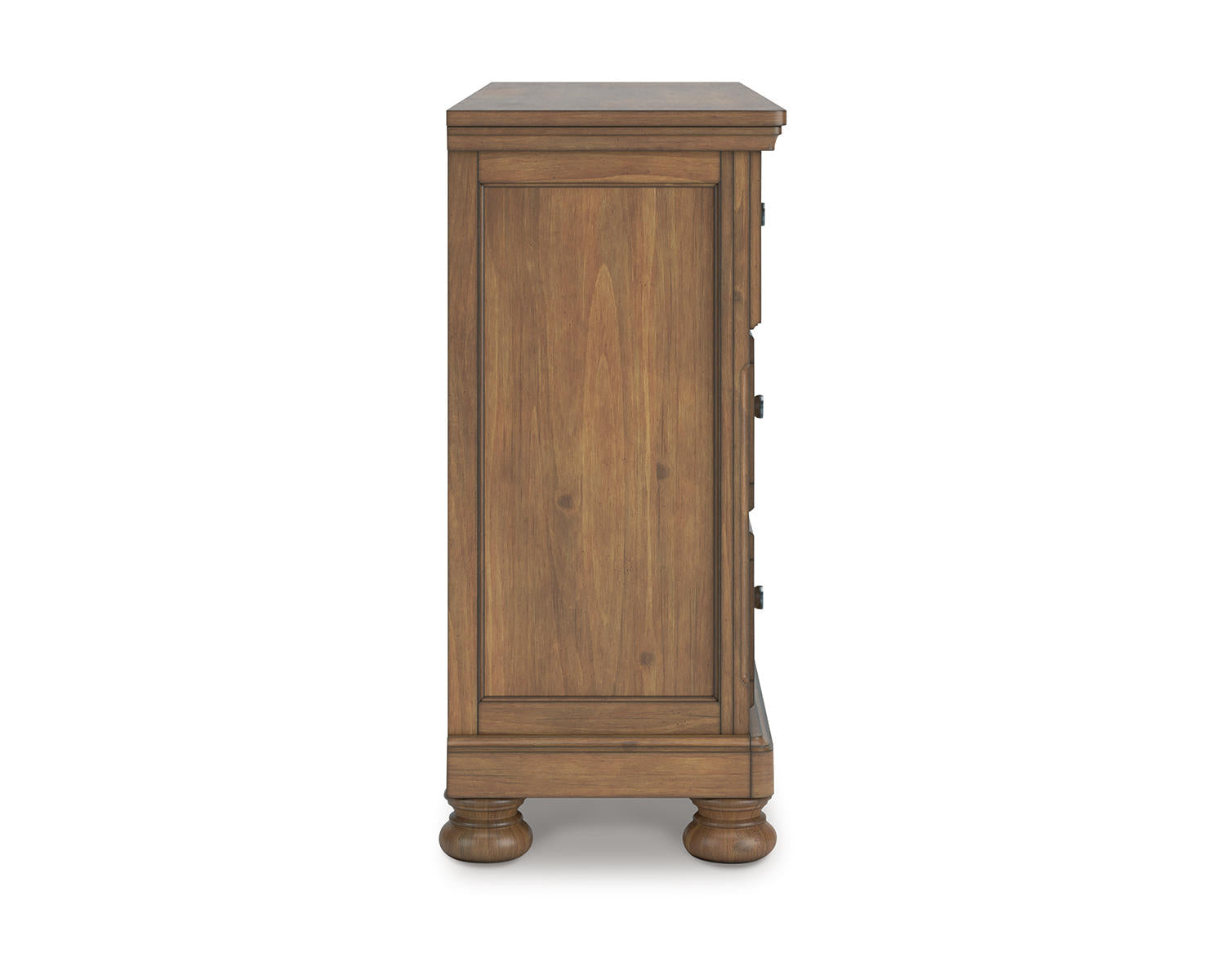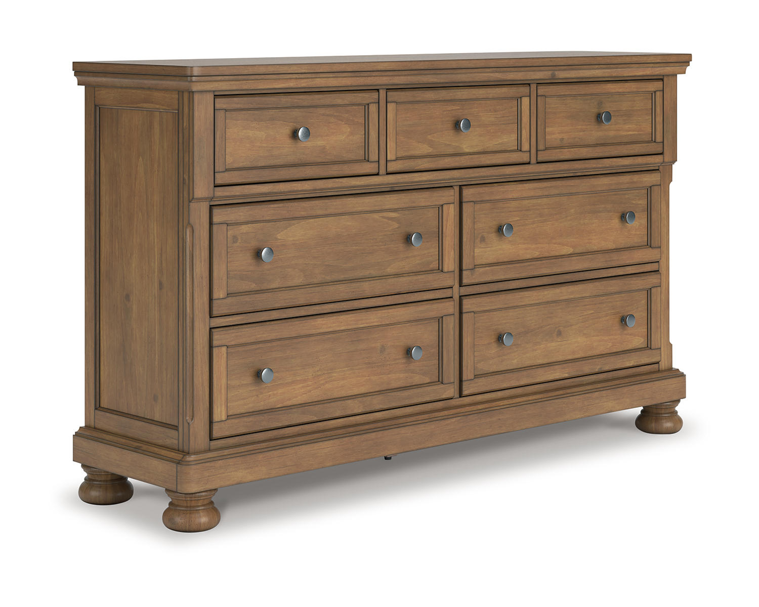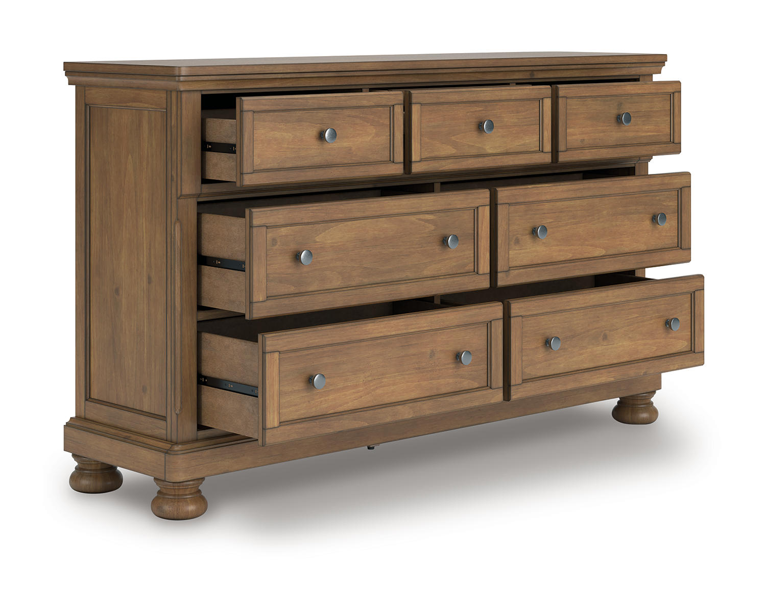 The Feddinger Dresser is a medium brown storage piece that brings order and warmth to bedrooms, hallways, or living spaces. It combines a timeless finish with a versatile silhouette, making it a practical choice for anyone who values organized space without sacrificing style.