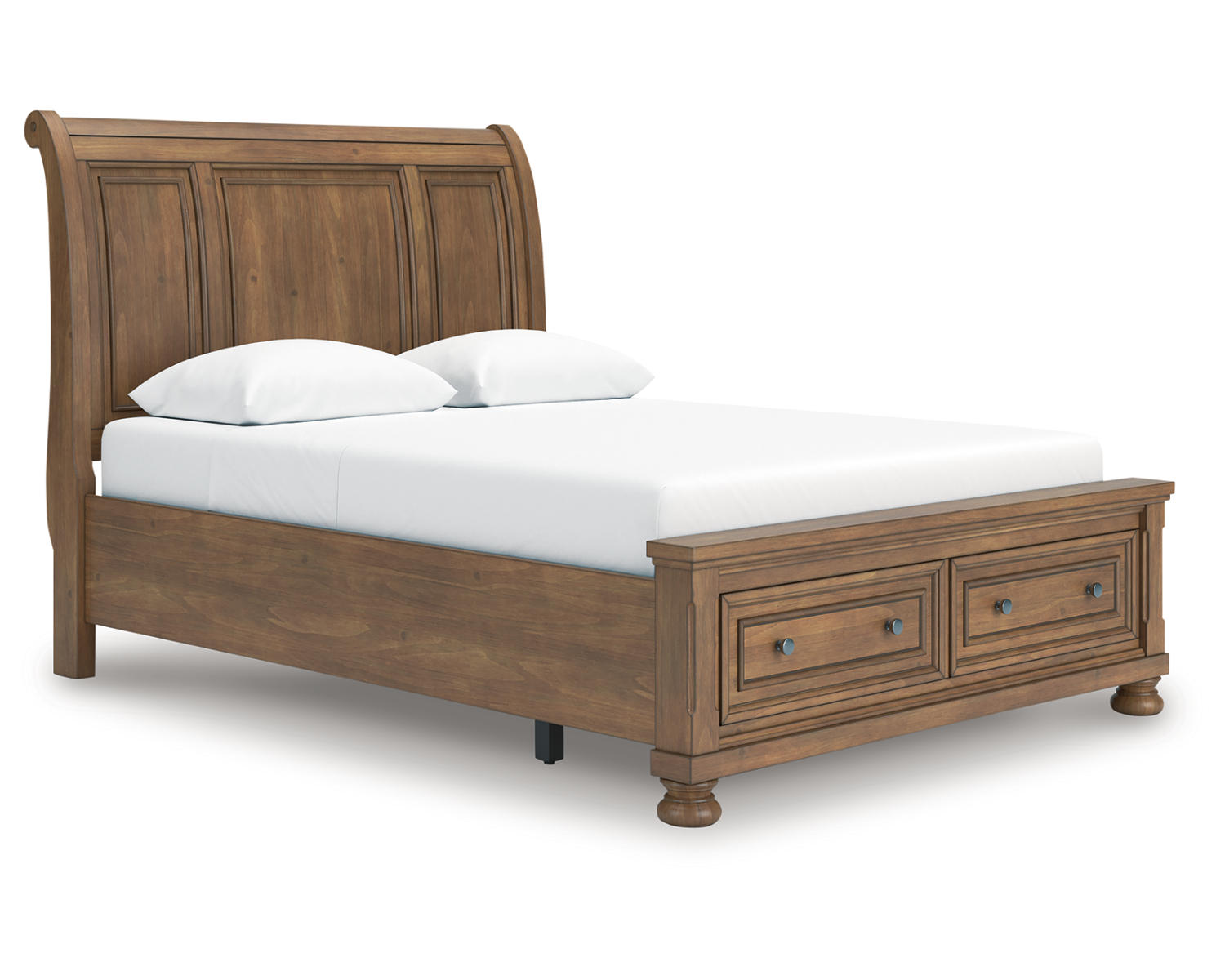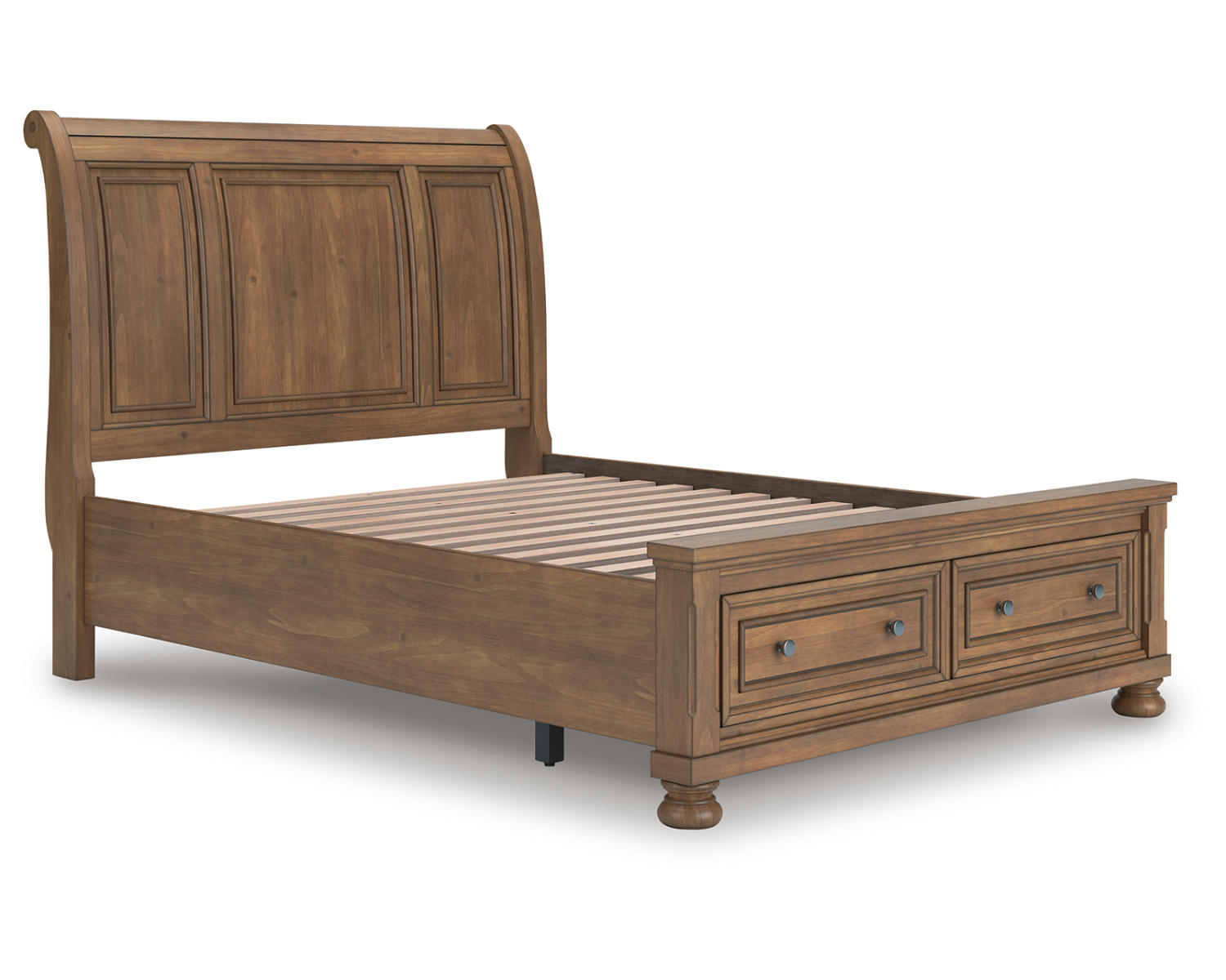 Meet the Feddinger Queen Storage Sleigh Bed in a warm Medium Brown finish. This bed combines timeless sleigh styling with practical under-bed storage, making it ideal for bedrooms that value both beauty and organization. Designed for standard queen mattresses, it's a versatile centerpiece that fits a range of interior styles.