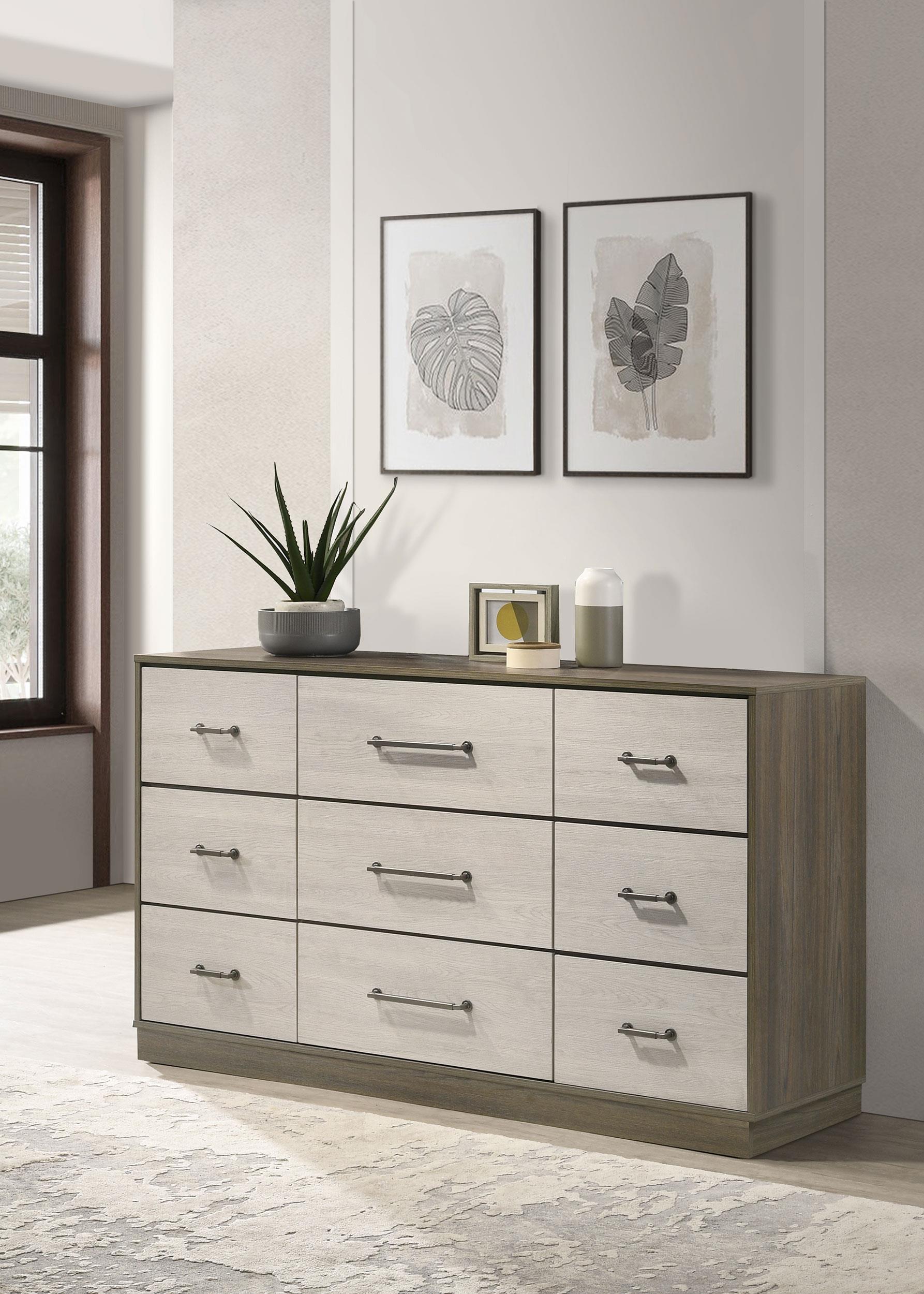 The Fenwick 9-drawer Dresser in Grey Oak combines practical storage with a clean, contemporary look. Designed for modern bedrooms, it provides ample space to organize clothing, accessories, and linens while adding a touch of refined style.