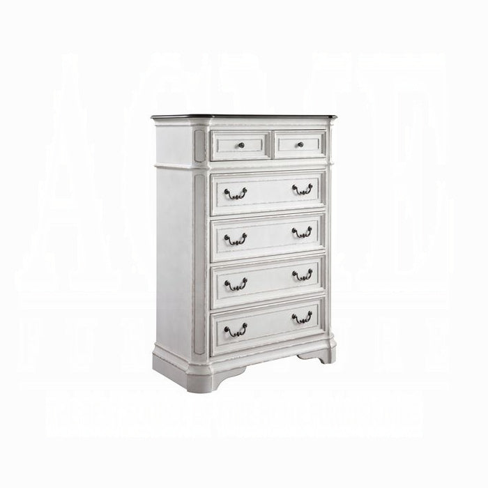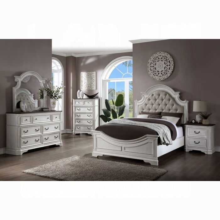 - Antique white finish with subtle distressing for a timeless, lived-in look