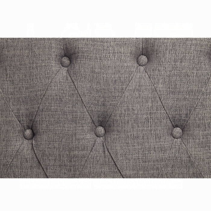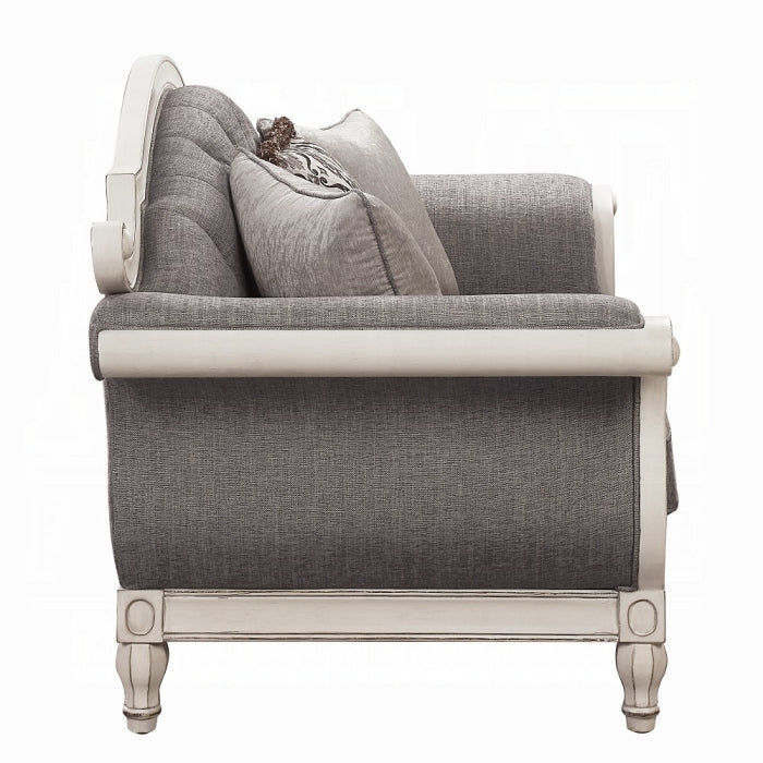 Meet the Florian Loveseat W/3 Pillows—where rustic charm meets modern flair. This space-conscious piece is designed for everyday living and smaller rooms, delivering comfortable seating with a refined aesthetic. The combination of gray fabric, antique white accents, rolled arms, and classic button tufting creates a timeless focal point for your living space.