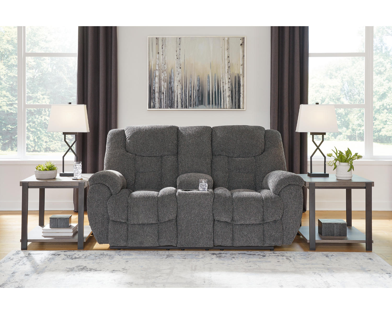 Meet the Foreside Reclining Loveseat with Console in Charcoal — the comfortable two-seater choice for living rooms, media spaces, or lounging areas. Designed for everyday use, it blends practical features with timeless style that fits a range of decors. Enjoy a smooth recline and a built-in console for convenience.