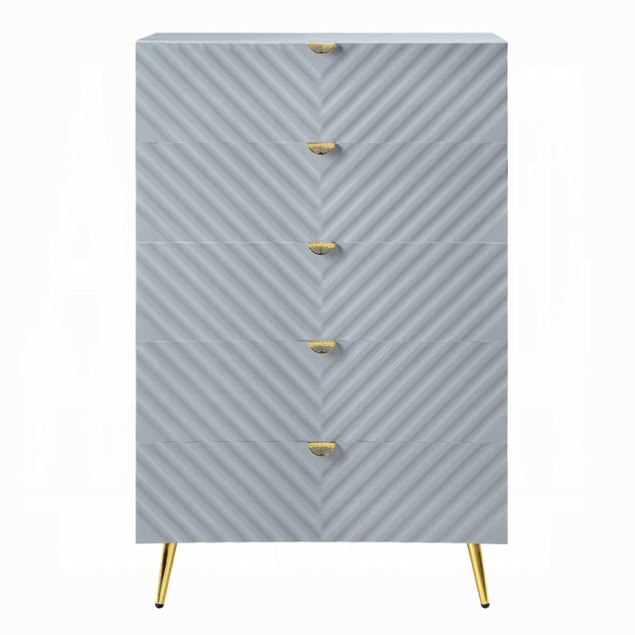 Elevate your space with the Gaines Chest from the glamorous Gaines Collection. This storage piece is designed for modern rooms that value chic style and clean lines. The gray gloss finish and gold metal accents create a refined look, while the diagonal line design adds texture and visual interest.