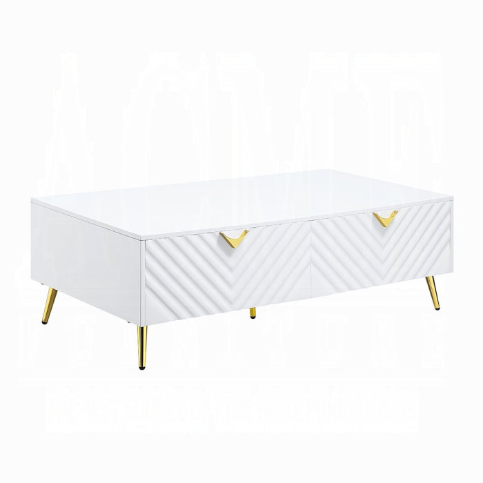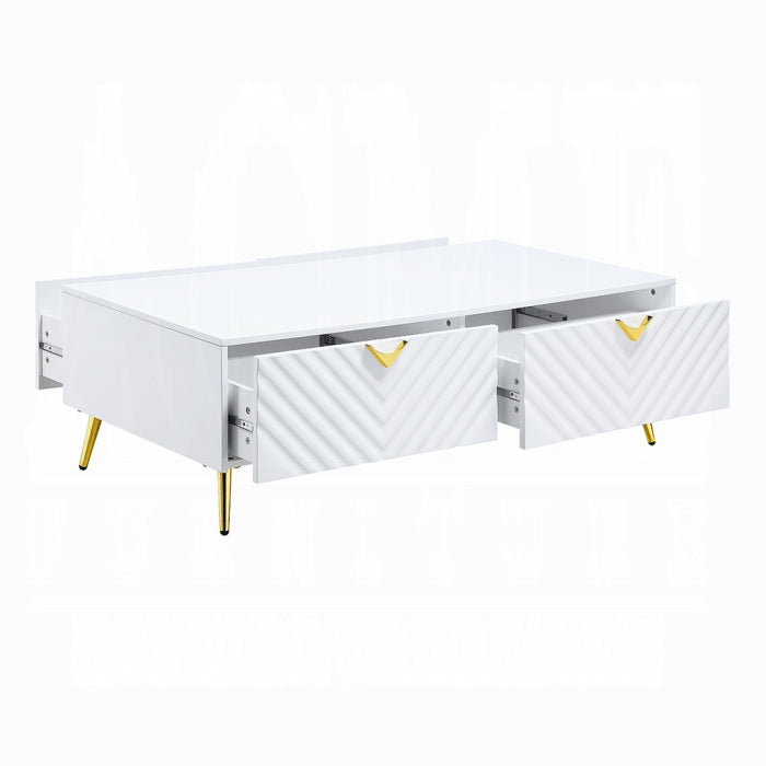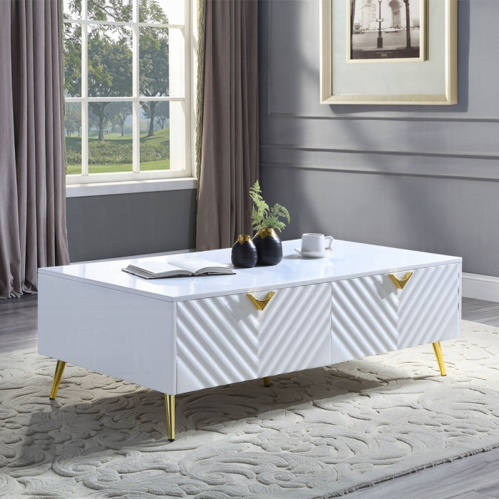 Chic and contemporary, the Gaines coffee table makes a refined focal point in modern living spaces. With gold legs and hardware and a high gloss white finish, it blends elegant style with everyday practicality. The raised textured panel drawer fronts add a subtle flare, while two storage drawers keep essentials neatly tucked away.