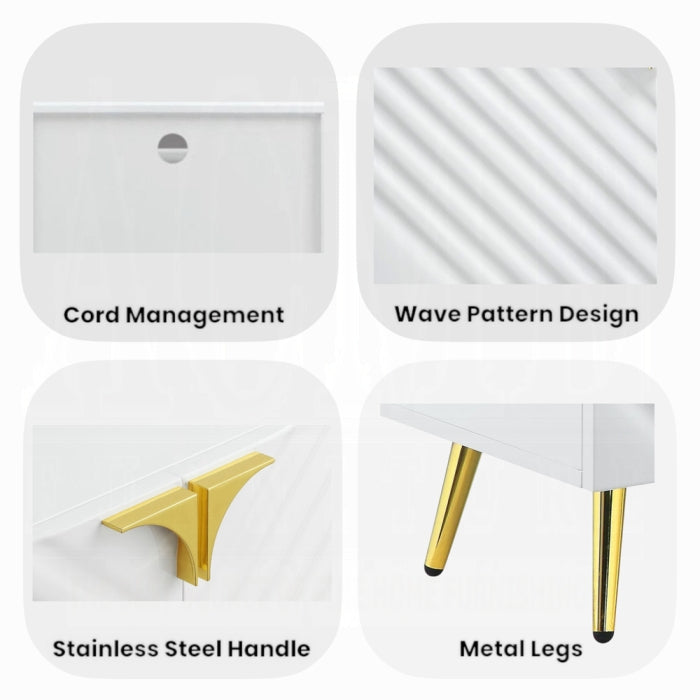 Meet the Gaines TV Stand—a contemporary, chic centerpiece designed for modern living spaces. Featuring a high gloss white finish and luxe gold legs and hardware, it blends style with practical design to elevate any entertainment setup.