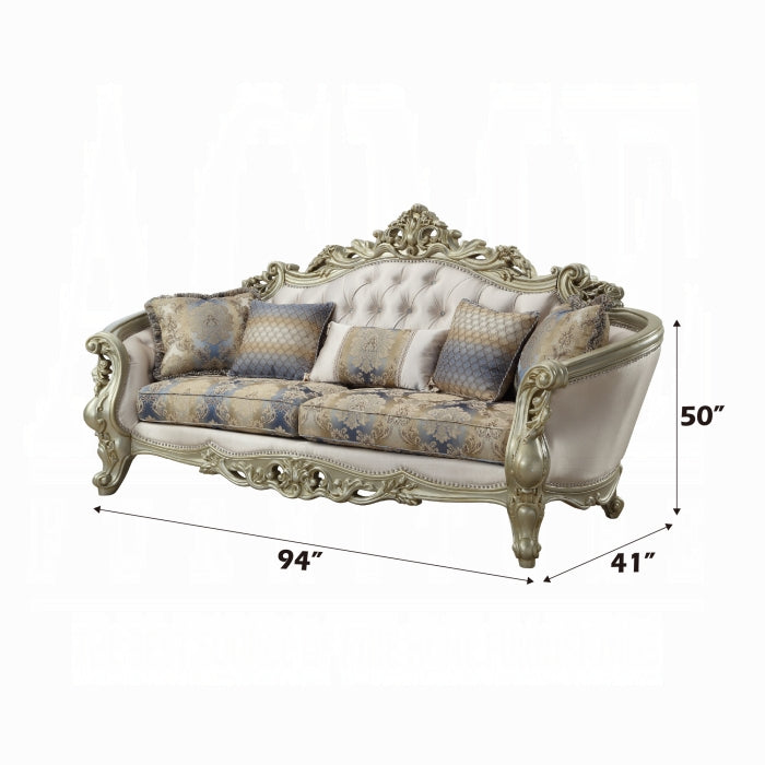 Exclusively designed and filled with romantic spirit, this sofa elevates any living space with timeless elegance. Featuring Queen Anne legs, carved aprons and trims, and ornate raised and scrolled floral motifs in a golden ivory finish, it adds a refined, inviting presence to your seating area. Curved and rolled arms and five accompanying pillows complete a luxurious centerpiece for lounging and entertaining.