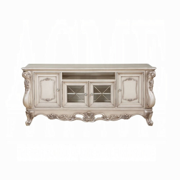 Exclusively designed and filled with romantic spirit, the Gorsedd entertainment center showcases Queen Anne legs, a carved apron and trim, and raised, oversized scrolled moldings in a golden ivory finish. This sophisticated living room unit establishes a refined focal point while coordinating with matching case pieces for a cohesive look.