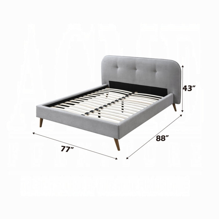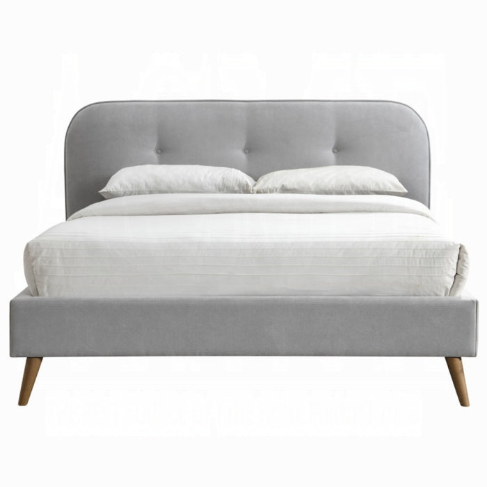 Graves Queen Bed blends an unexpected gray tone with natural wood accents to create a relaxing sleep environment. This fully upholstered bed features a button-tufted headboard for a comfortable spot to lean on, while gray fabric adds texture and depth to your bedroom. The elegant wooden legs complete the look with a touch of natural warmth, making it a versatile centerpiece for contemporary bedrooms.