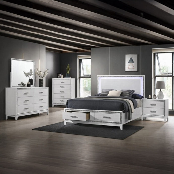 The Haiden EK Bed with LED lighting and built-in storage blends a timeless silhouette with modern functionality. Designed for bedrooms that value clean lines and practical storage, it features an LED-lit headboard and a storage footboard. A shimmering silver accent trim adds a touch of glamour without overpowering the room.