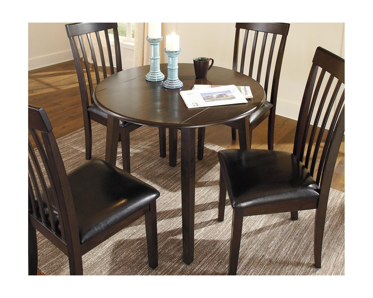 Introducing the Hammis Dining Drop Leaf Table—a round, space-saving dining solution designed for small spaces. Finished in a rich dark brown, this table brings warmth and versatility to any kitchen or dining nook. The round profile fosters conversation and makes the most of limited floor space.
