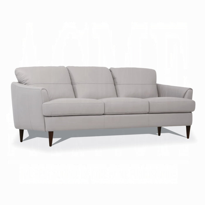 The Helena sofa set is one you'll want to spend lots of time in. Designed with contemporary fashion, this beautiful moss green or pearl gray leather sofa features a T-shape cushion with contrast tone stitching and unique tapered wood legs. Its deep, comfy seat and slope style padded arms give it an inviting, relaxed feel that fits easily into modern living spaces.