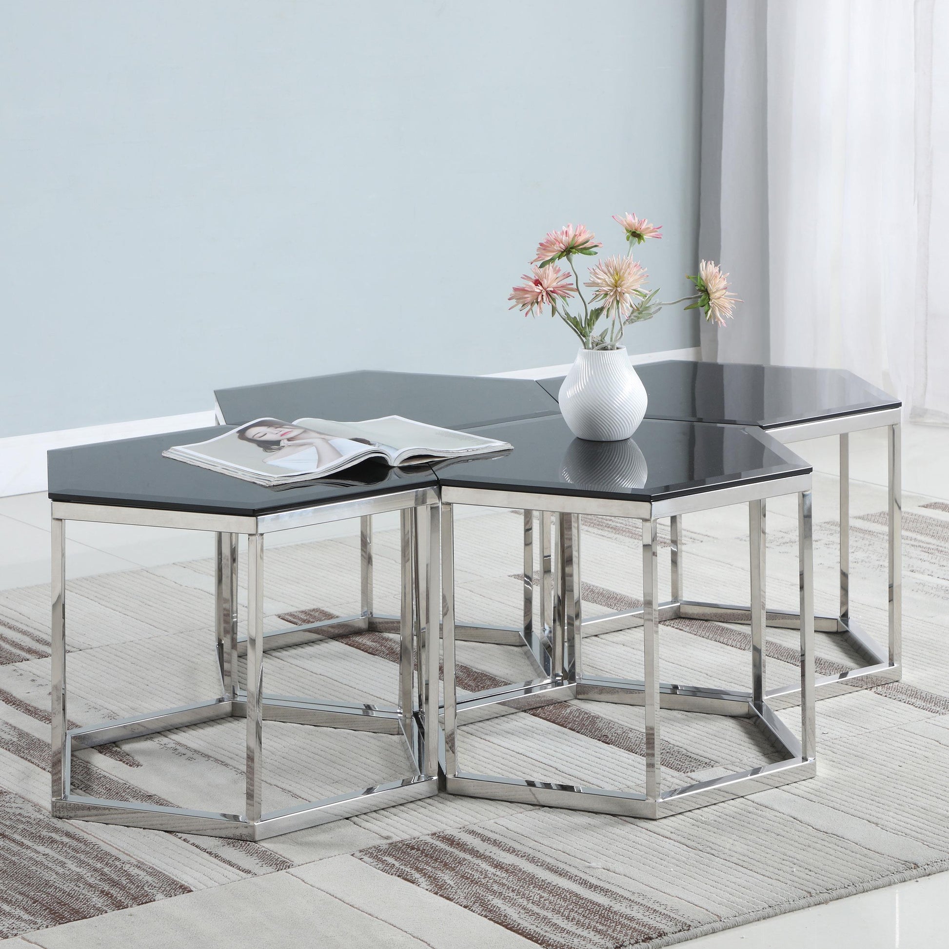 - Hexagonal smoked glass top—a contemporary centerpiece that pairs with any decor.