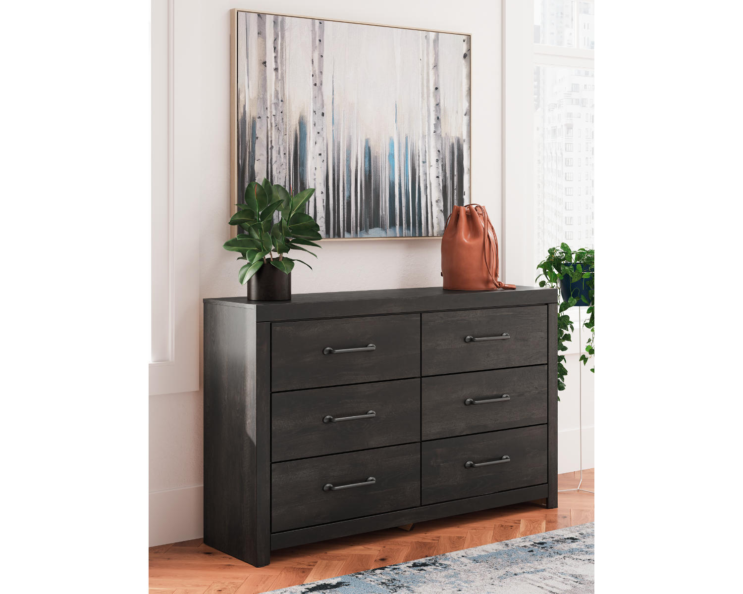 Introducing the Hollivern Dresser — a six-drawer storage solution crafted for bedrooms that value organization and clean, modern style. This piece is designed for anyone who wants spacious storage without sacrificing a calm, minimalist aesthetic. Its dark gray finish pairs easily with a range of decors, from contemporary to transitional.