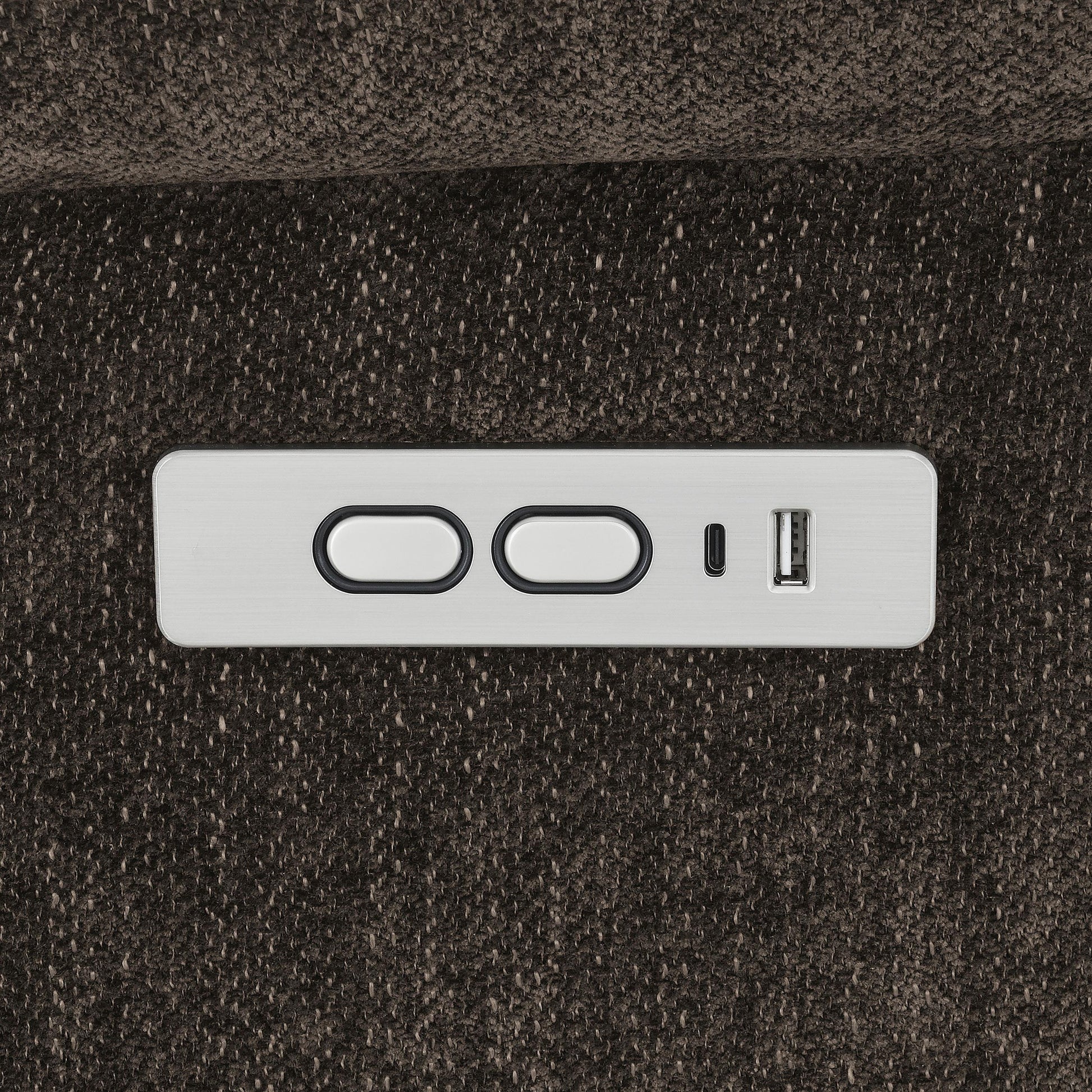 - Dark brown upholstered fabric: durable, neutral finish that coordinates with most interiors.