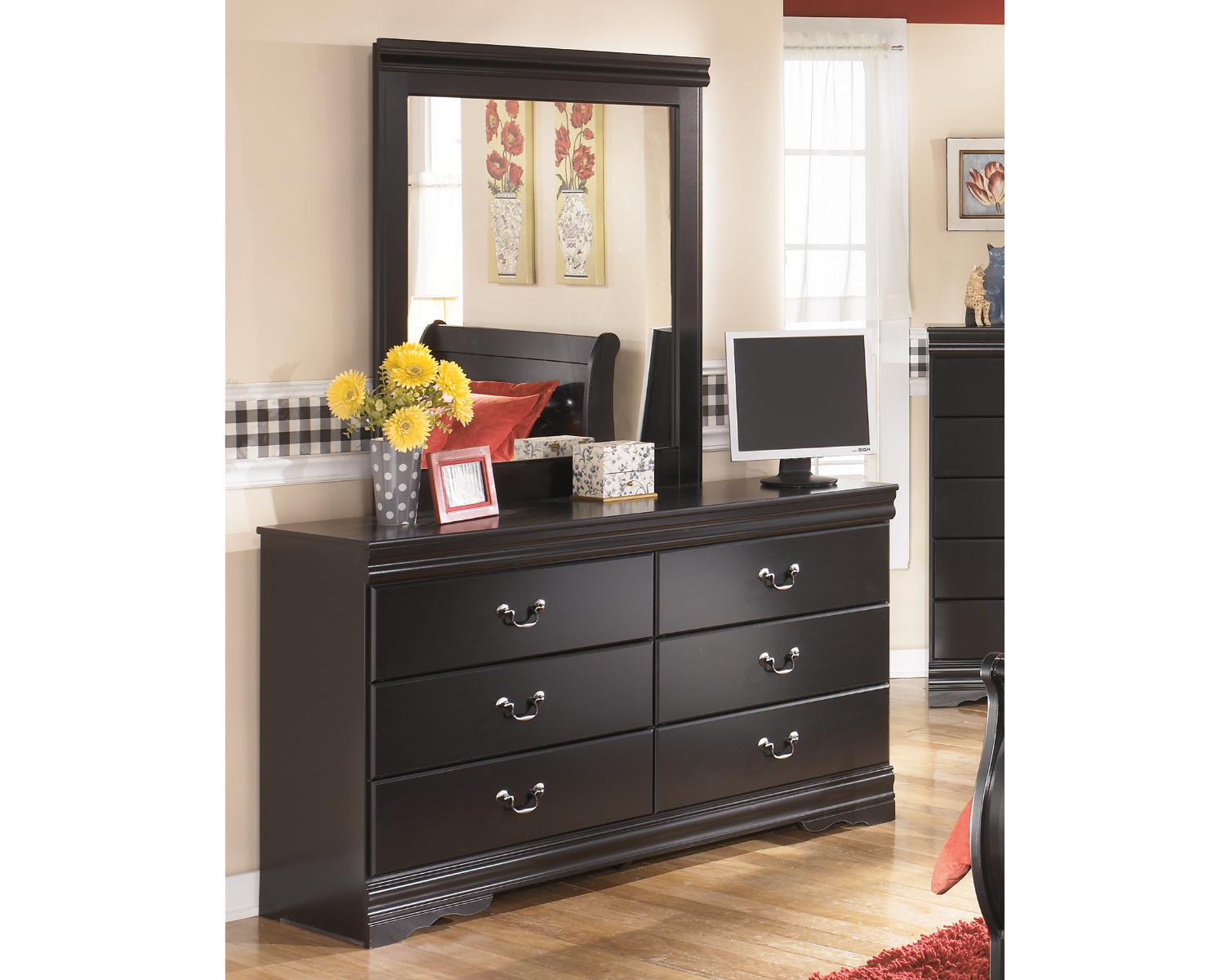 Meet the Huey Vineyard Dresser and Mirror — a stylish black dresser and coordinating mirror designed to organize your space with a touch of refined elegance. Ideal for bedrooms that value both storage and a cohesive, modern look, this set blends function with everyday charm.