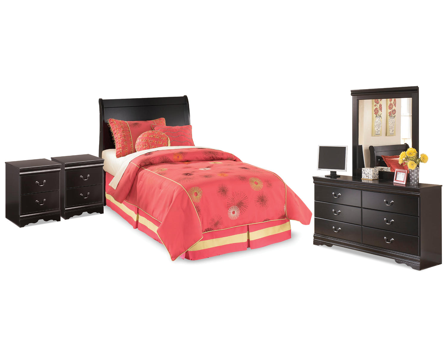 Discover a cohesive bedroom suite designed for twin-size spaces. The Huey Vineyard collection blends classic sleigh silhouettes with a warm vineyard finish to create a timeless, inviting look. This set includes a twin sleigh headboard, dresser, mirror, and two nightstands—everything you need to refresh a small or guest bedroom with style and organization.