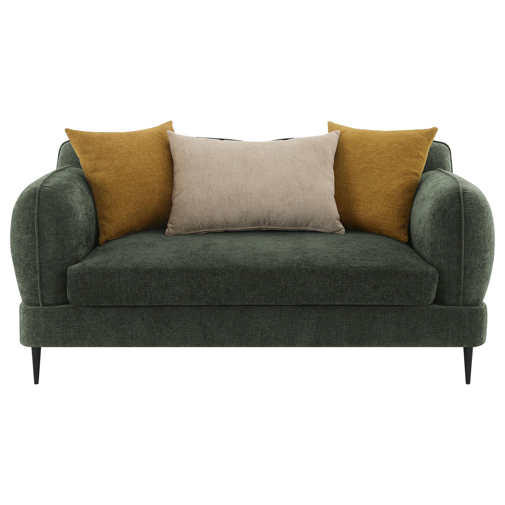 - Green chenille upholstery adds a warm, inviting look that pairs with many decor styles.