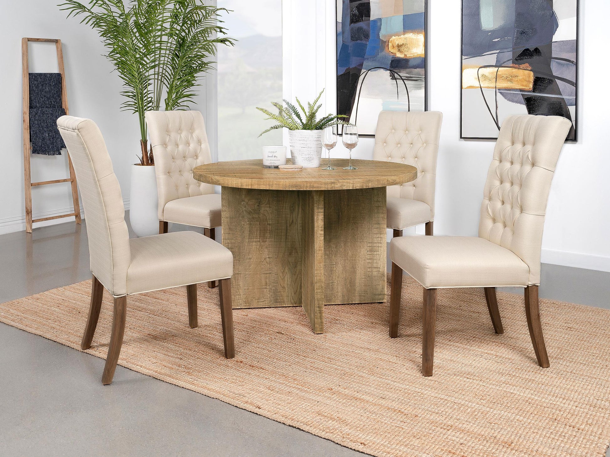 The Jamestown table uses durable composite wood construction designed to withstand daily use while maintaining a smooth, stylish appearance. Its sturdy round design provides reliable stability for meals, décor, and gatherings. Coupled with the Mango finish, this table offers excellent value with a timeless look that fits a range of dining spaces.
