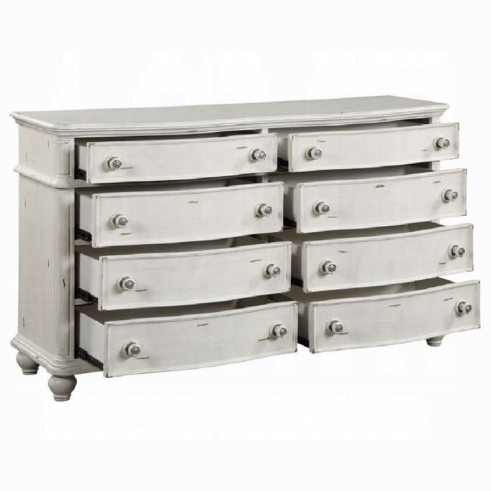 Keep your bedroom organized in understated elegance with the Jaqueline Dresser. Designed for everyday use, it offers six spacious drawers for ample storage and a traditional aesthetic that enhances classic bedrooms. The piece combines sturdy wood construction with a refined antique white finish for a timeless look.