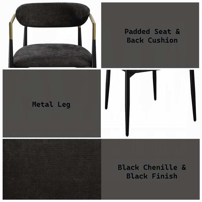 - Finish: Black Chenille upholstery & Black Finish on the frame