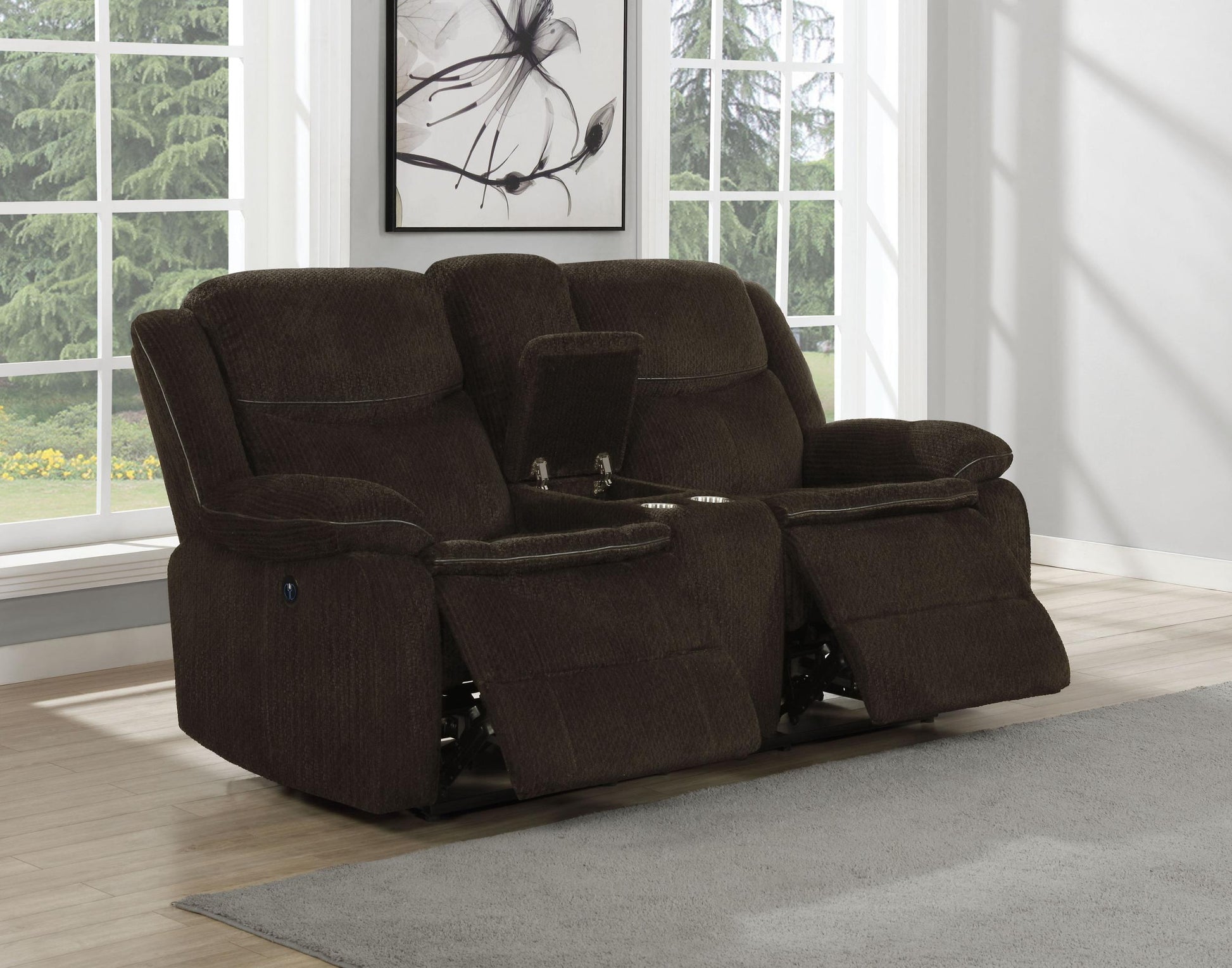 Meet the Jennings Upholstered Power Loveseat with Console in Brown—an approachable, comfortable seating solution designed for modern living spaces. It’s ideal for movie nights, lounging after a busy day, or hosting guests in style. Enjoy effortless comfort with a built-in console that keeps essentials within arm’s reach.