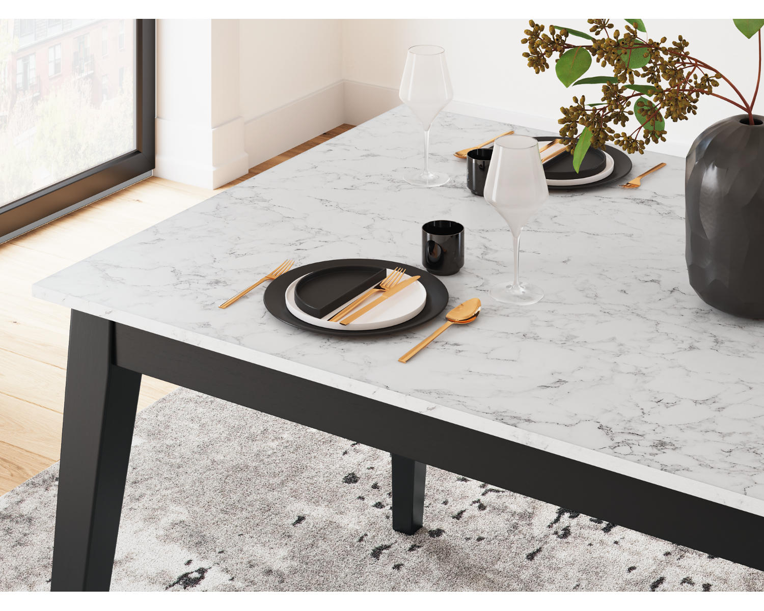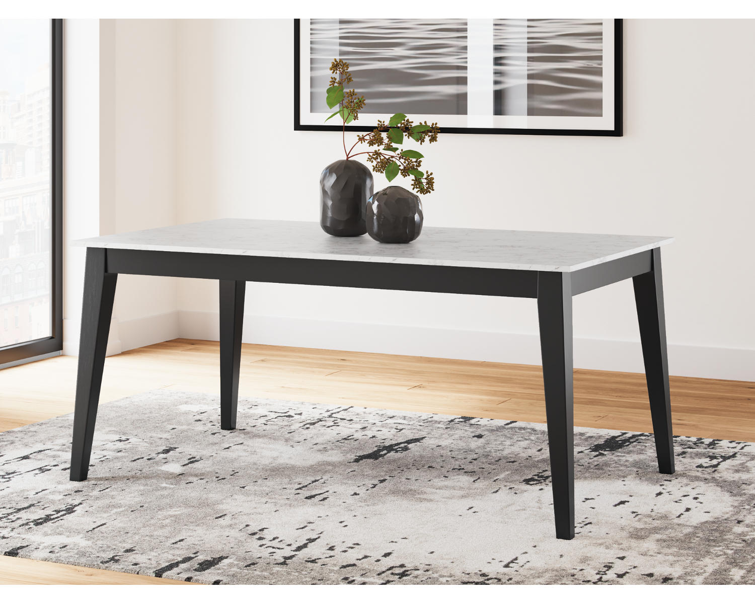 - Rectangular dining surface with a contemporary black and white finish.