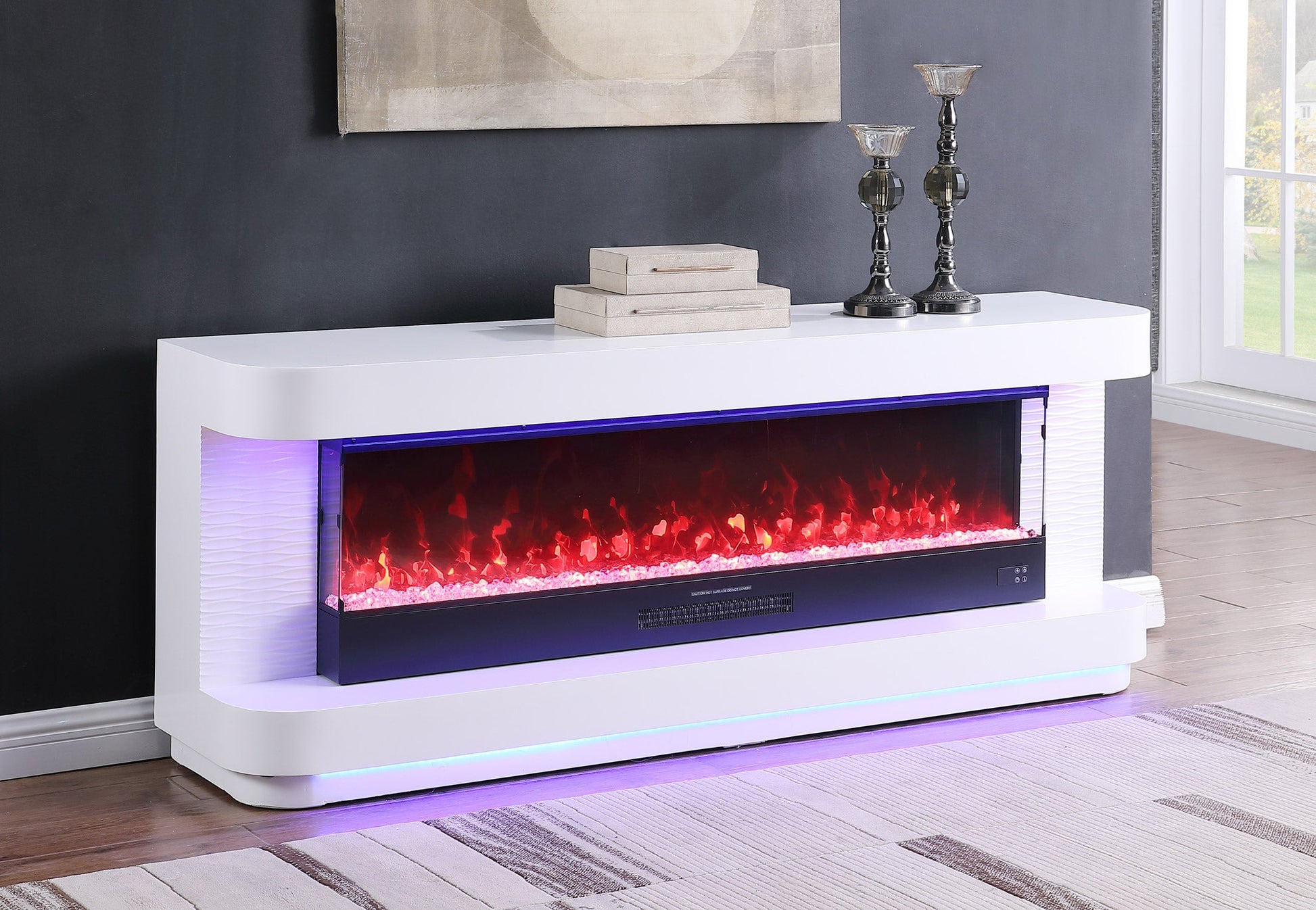 Introducing the Jive Fireplace, a contemporary console that blends a curved frame with an integrated electric fireplace. Designed for modern living spaces, it's ideal for living rooms and lounges that value clean lines and ambient warmth. Its matte finish and subtle LED accents create a refined focal point without overpowering the room.
