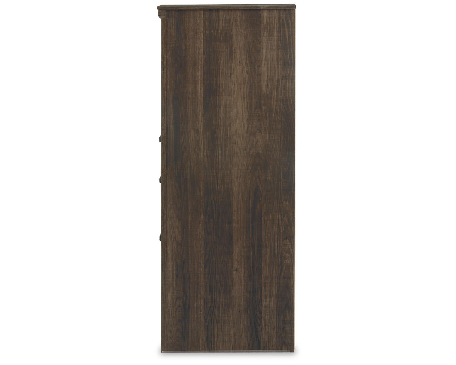 Juararo King Poster Bed, Dresser, Chest and Nightstand — Dark Brown