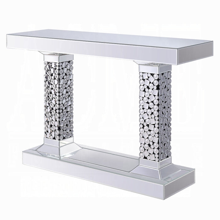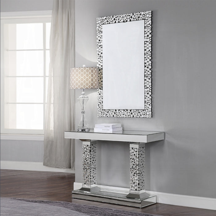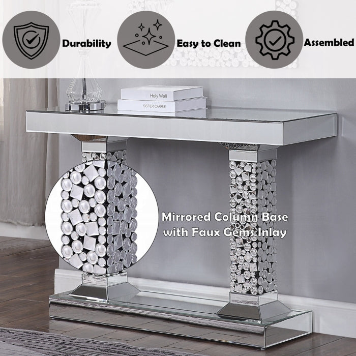 The Kachina Console Table adds a contemporary touch to any room. This rectangular occasional table is designed for modern living spaces, offering clean lines and a distinctive style that elevates entryways, living areas, or hallways. A tempered glass surface combined with a fully mirrored frame creates a sleek, reflective centerpiece that pairs with a range of decor.