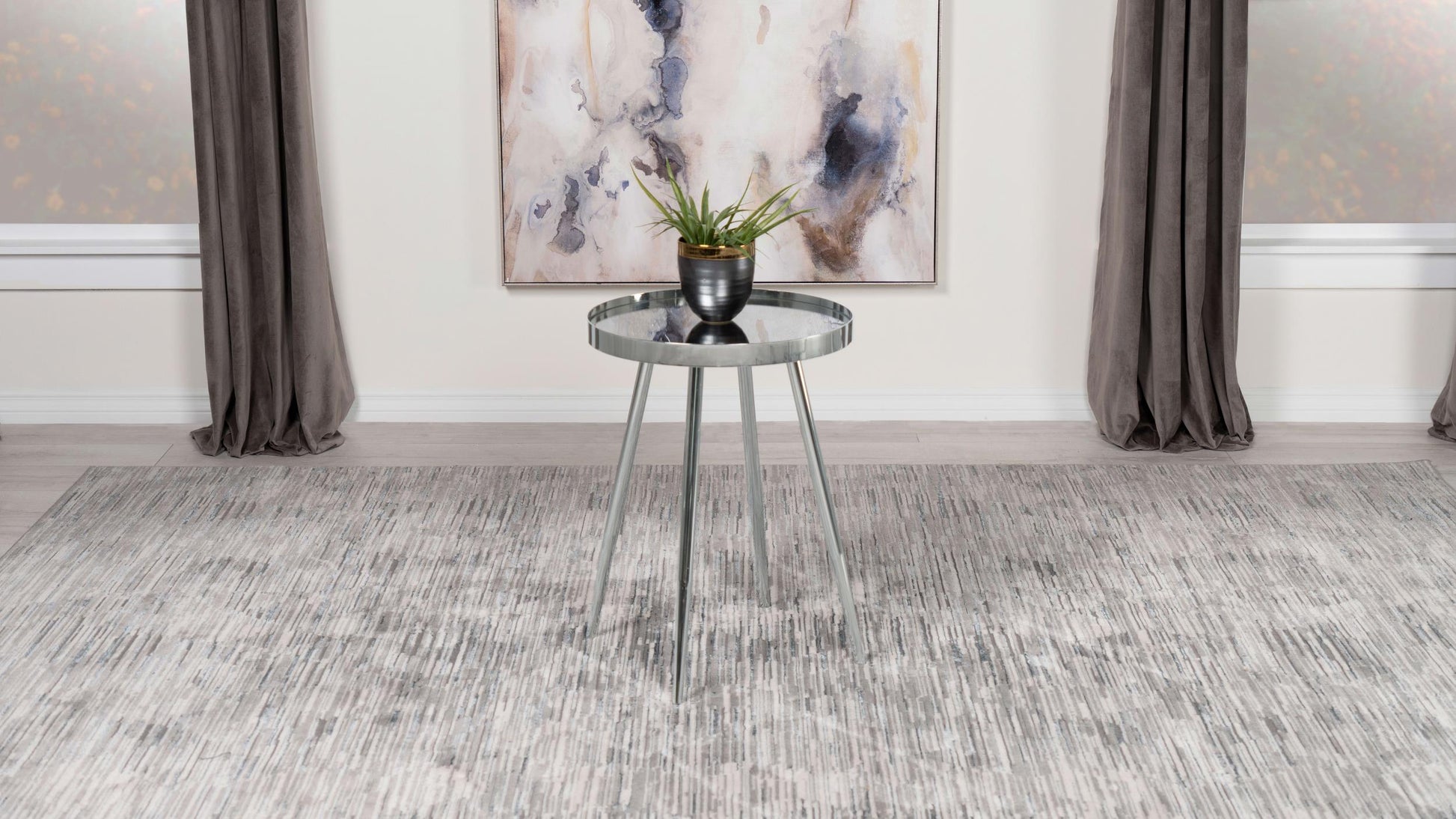 The Kaelyn Round Mirror Top End Table in Chrome blends modern style with practical utility. It features a round mirror top paired with a polished chrome frame, adding brightness and a touch of glamour to any living space. Designed to sit beside a sofa or chair, it provides a convenient surface for drinks, books, and décor while keeping a light, open feel.