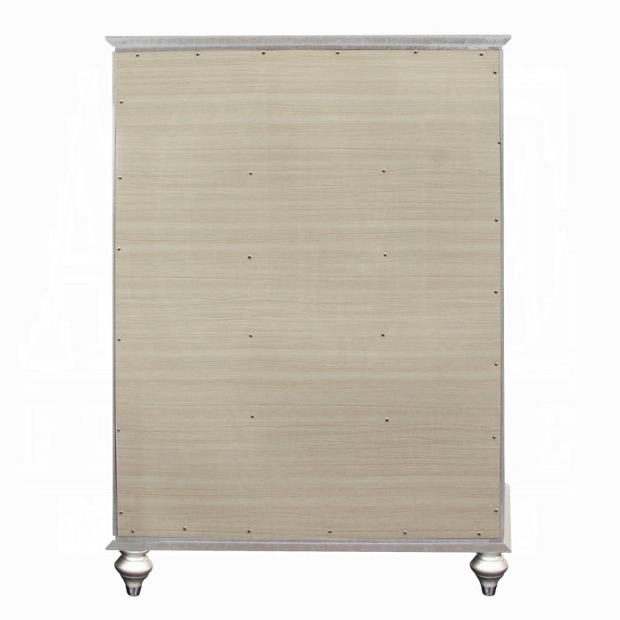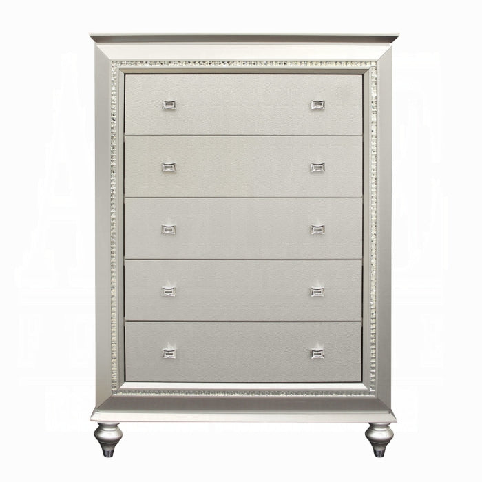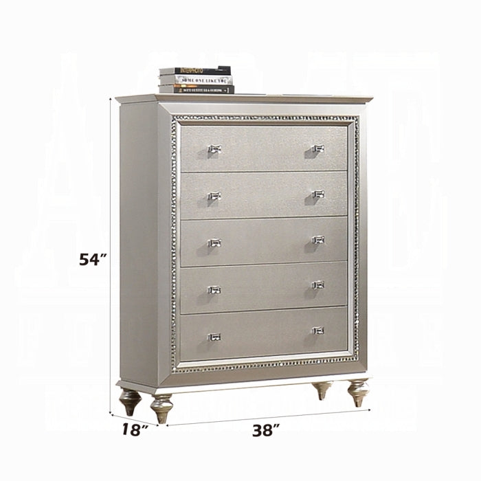 The Kaitlyn chest provides a commanding presence in any room. Crafted with a transitional look that is an ideal addition to any bedroom, the chest is accented with a textured front and a crystal-like sparkling trim. Its crystal-like trimming creates a dazzling glow for your master bedroom.