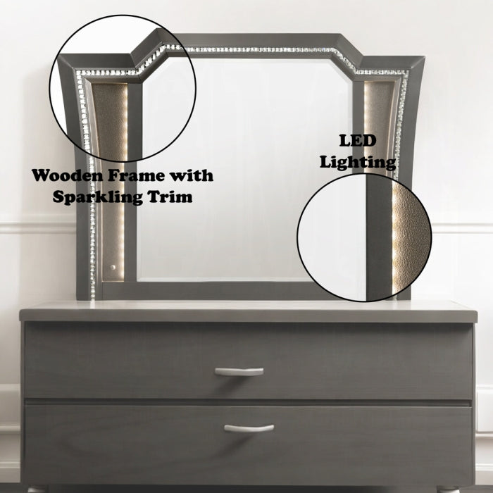 The Kaitlyn Mirror W/Led makes a bold statement in any bedroom or dressing space. This transitional-style mirror pairs clean lines with a subtle glow, elevating your space without overpowering it. Accented with LED lighting and crystal-like trim, it delivers a refined sparkle that enhances your master bedroom both day and night.