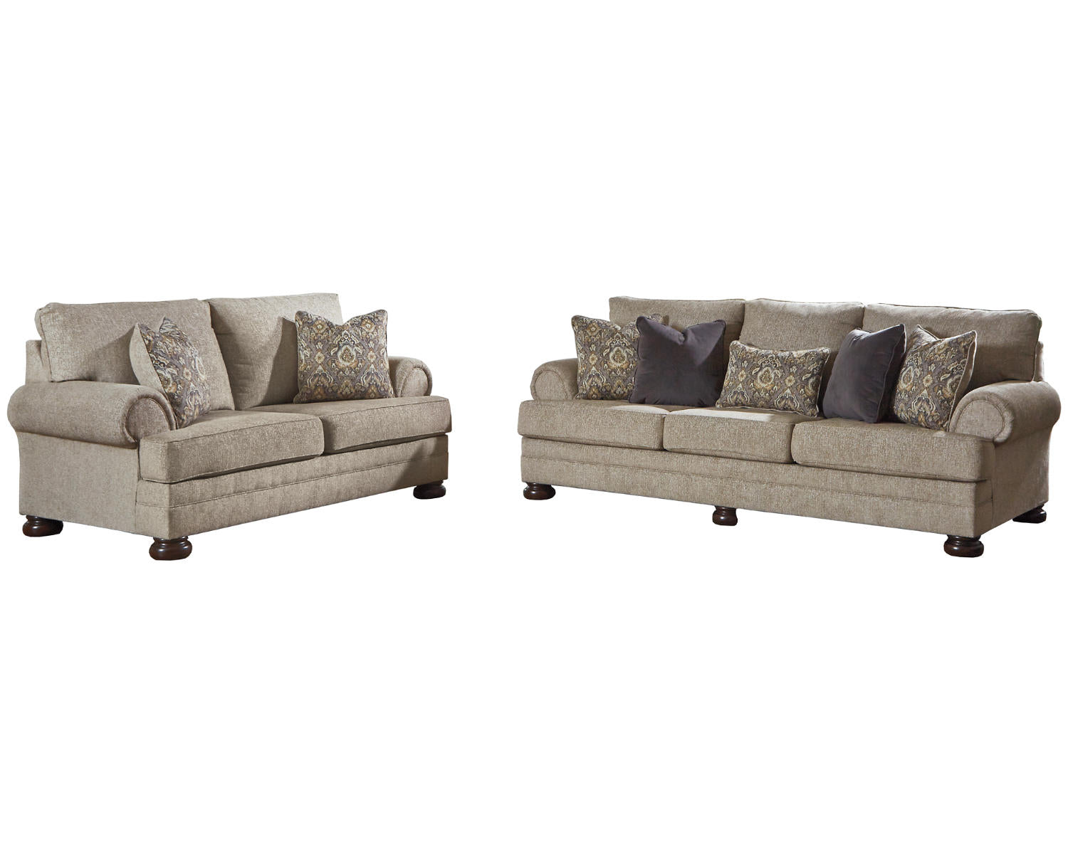 - Includes: sofa and loveseat in an oatmeal upholstery