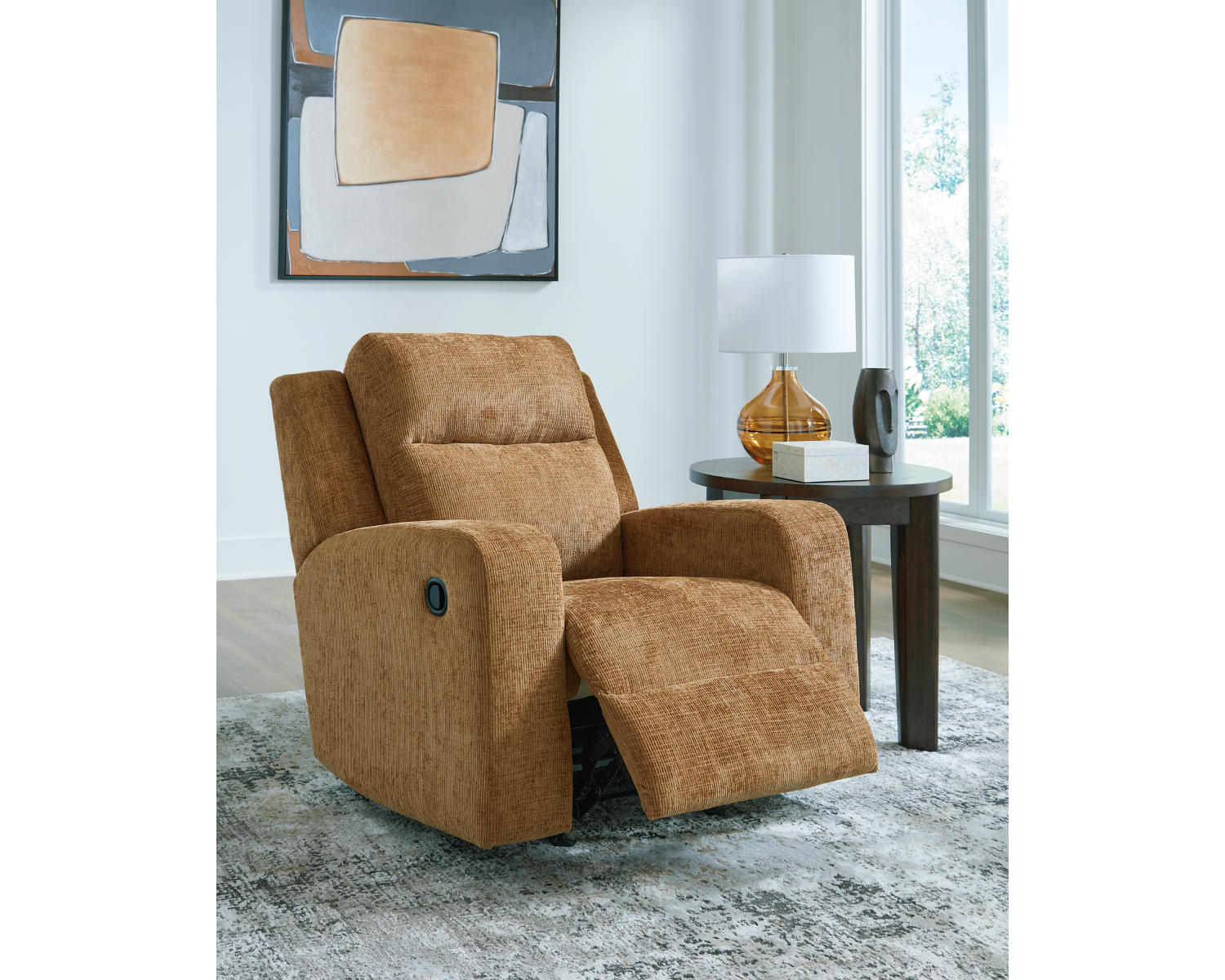 Meet the Kanlow Recliner, a comfortable rocker designed for relaxed seating. Finished in Honey, it adds a warm, inviting touch to living rooms, family rooms, or lounges. This rocker recliner combines easy operation with plush comfort for unwinding after a long day.
