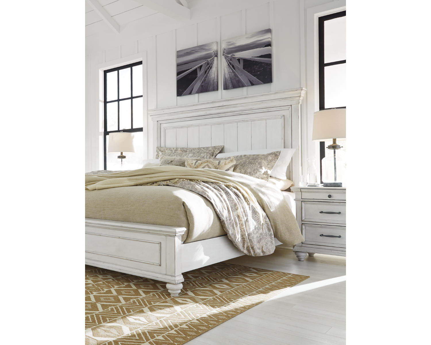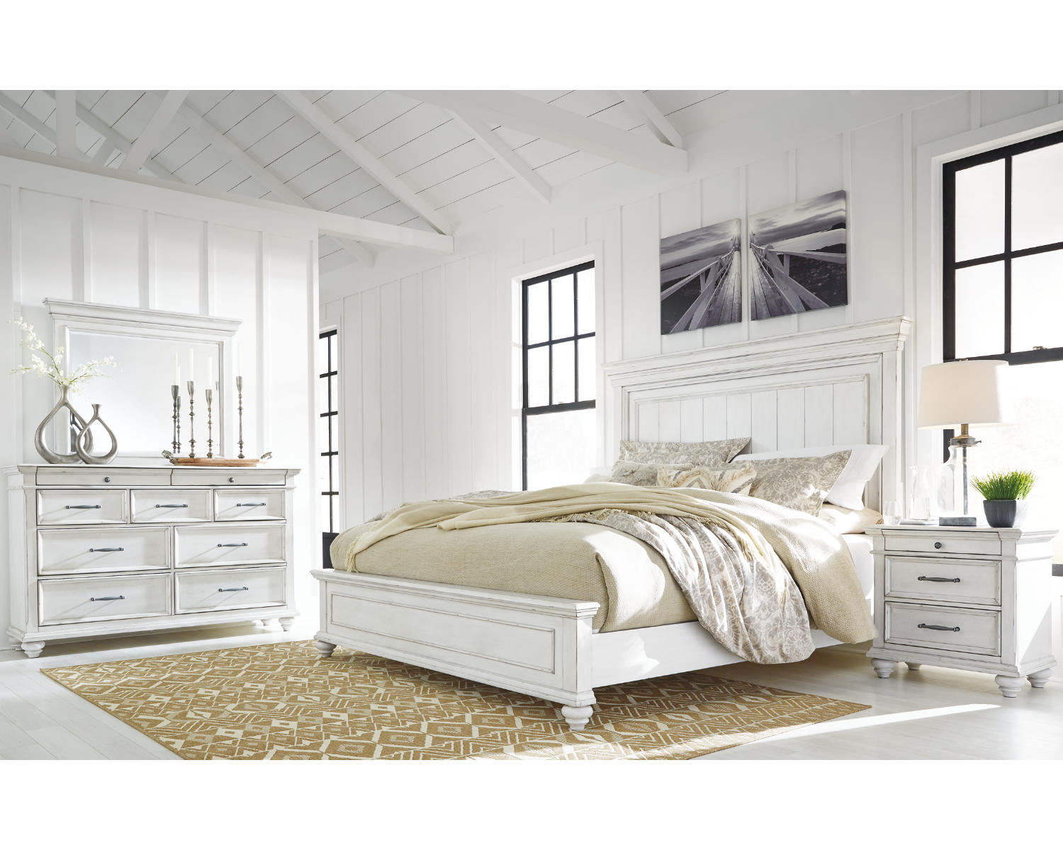 Kanwyn King Panel Bed, Dresser, Mirror and 2 Nightstands – Whitewash