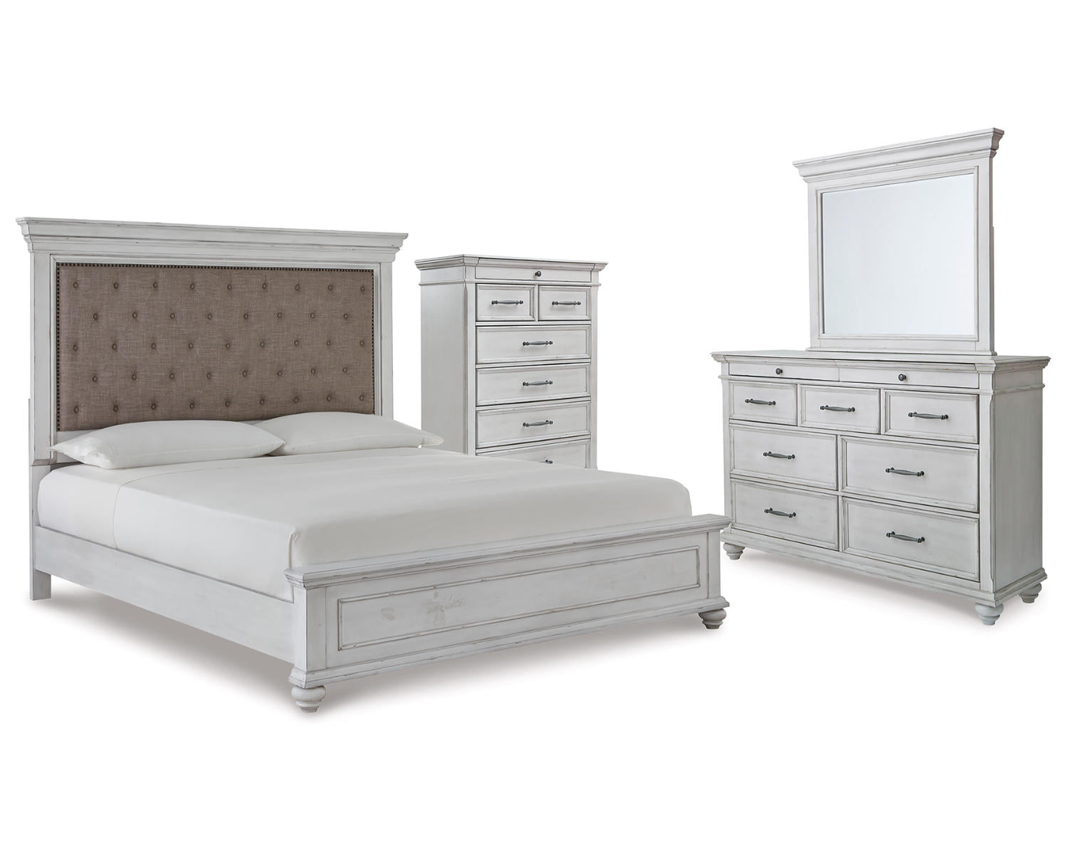Built to endure daily wear, the Kanwyn set combines sturdy framing with a durable finish that resists routine scratches and scuffs. The upholstered headboard adds comfort for reading and lounging in bed, while the dresser and chest provide organized storage without compromising style. This collection offers strong value with competitive pricing for a complete king-size bedroom solution.