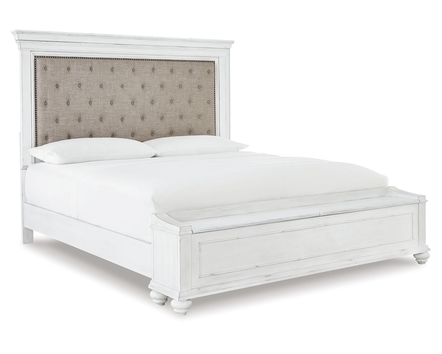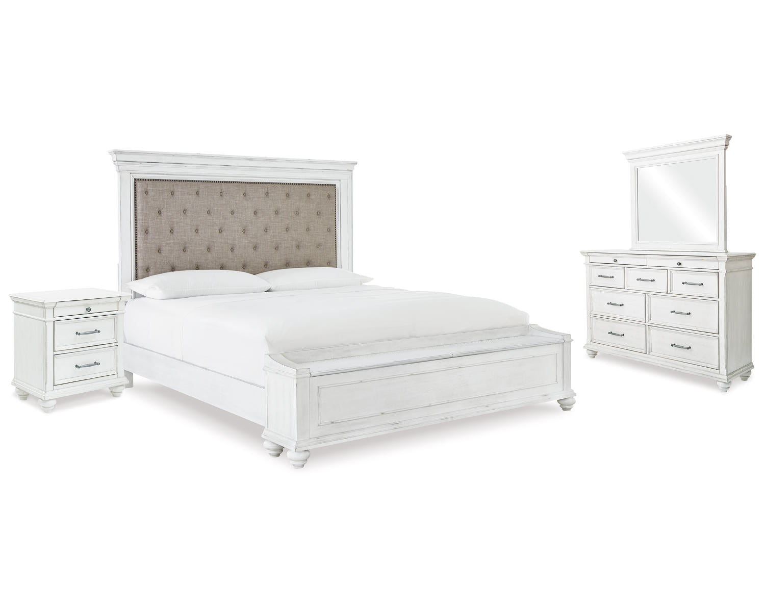 Kanwyn King Upholstered Storage Bed, Dresser, Mirror & Nightstand — Whitewash