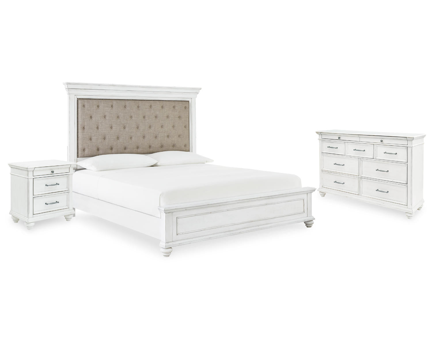 Kanwyn Queen Upholstered Panel Bed, Dresser, and Nightstand — Whitewash