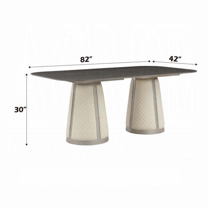 Designed for everyday meals and memorable gatherings, the Kasa Dining Table brings modern elegance to your dining space. It features a double pedestal base and a smooth sintered-stone rounded-edge tabletop. The pedestals are lightly padded and diamond-quilted with synthetic leather, finished in champagne for a stylish touch.