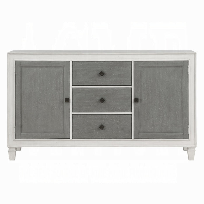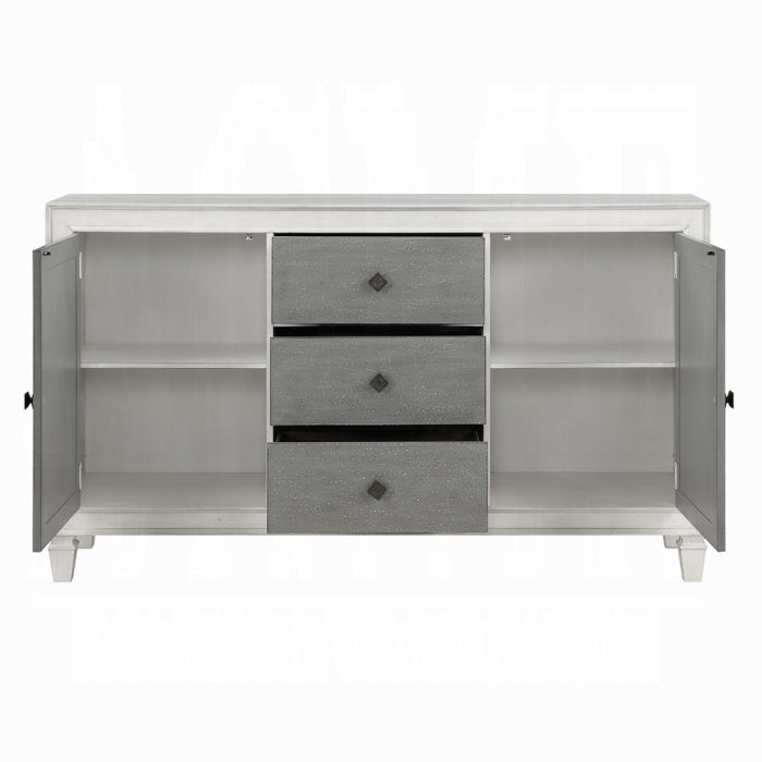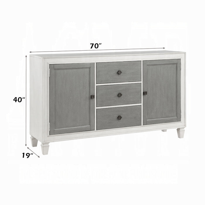 Add much-needed storage to your dining area with the Katia server. This server features three ample drawers and two side cabinets with a shelf on each side, perfect for all your extra dishware, glassware, and linens. The drawers and cabinet doors showcase gray fronts for a contrast to the weathered finish, bringing subtle texture and timeless style to your dining space.