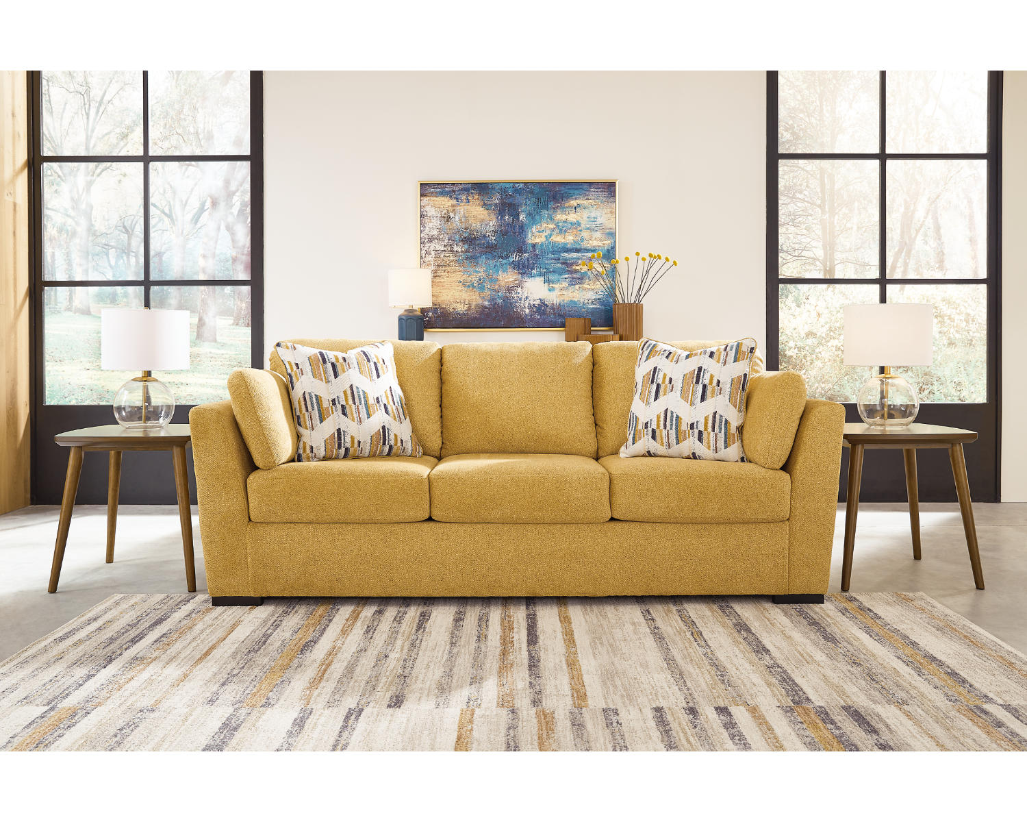 Meet the Keerwick Sunflower living room set—a complete, cohesive seating solution designed for modern homes. This five-piece ensemble includes a sofa, loveseat, ottoman, and two chairs in a cheerful sunflower hue, ideal for entertaining, family lounging, or relaxed everyday living. Built to adapt to your space, it offers versatile arrangement options and an inviting focal point for your living room.
