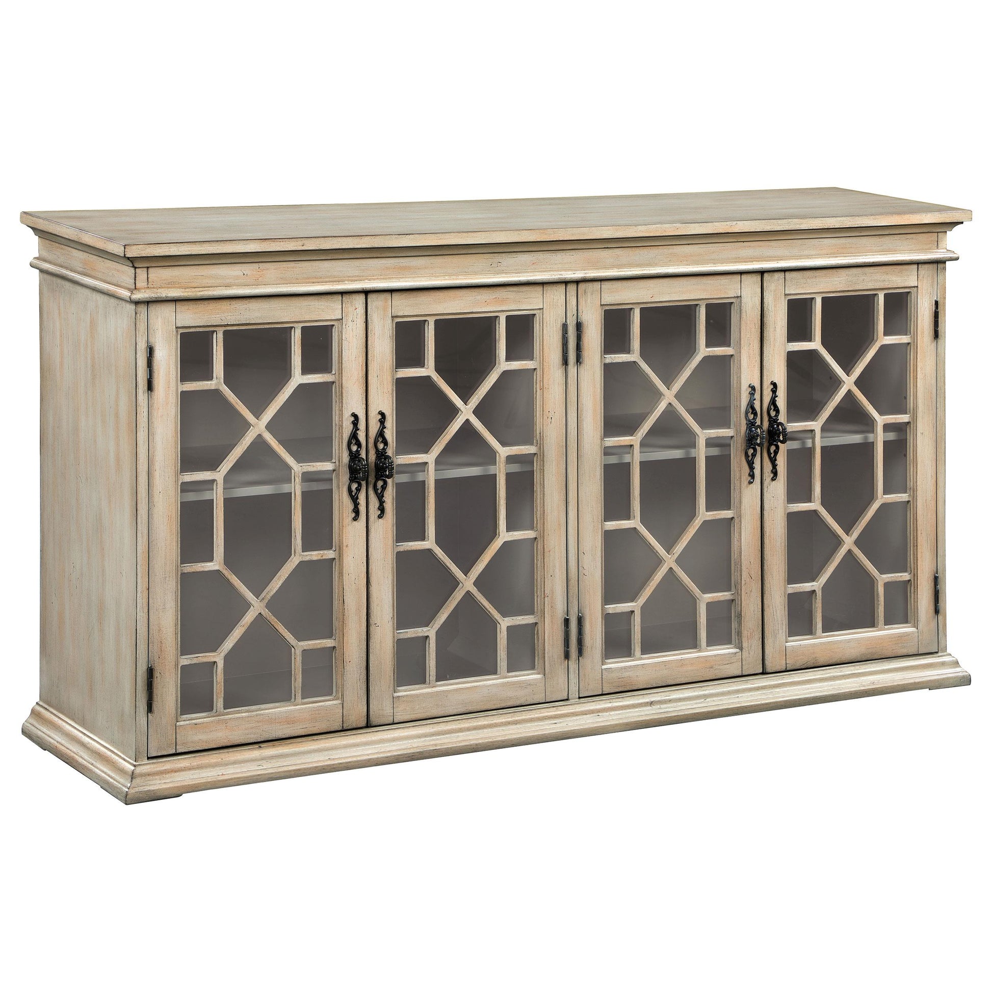 - Four lattice-panel doors open to reveal concealed storage space for organizing everyday items.
