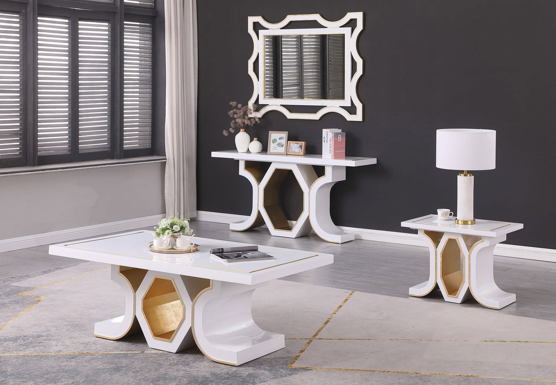 Meet the Laela collection—a modern furniture set that brings elegance, cohesion, and contemporary charm to your living space. It includes a coffee table, console table, side table, and a matching mirror, all designed to coordinate in a single, stylish package. The glossy white finish with gold accents and a geometric hexagon motif creates a luxurious, timeless look.