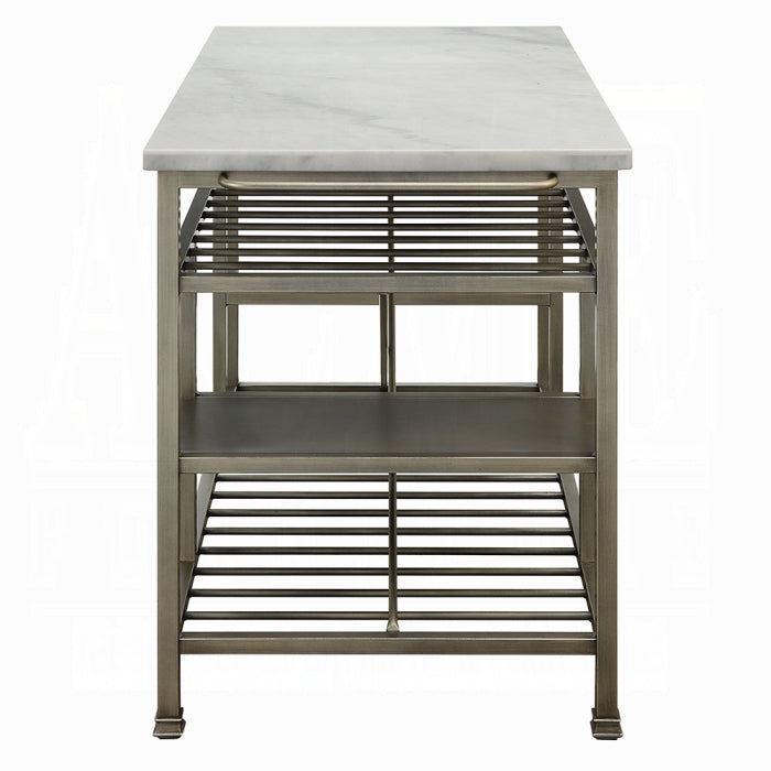 Introducing the Lanzo Kitchen Island, a versatile centerpiece for kitchens that crave extra counter space, efficient storage, and display-worthy style. Blending contemporary design with industrial charm, it elevates everyday tasks while keeping essentials close at hand. The metal frame adds an enduring industrial accent to the sleek marble top, delivering a stylish and practical upgrade for any kitchen.