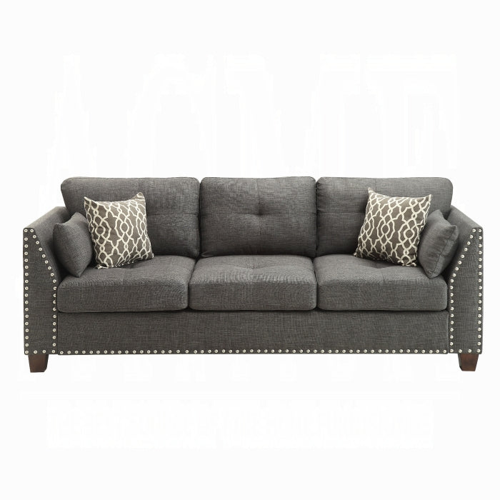 Make a chic addition to your living room or office with the Laurissa Sofa. This nailhead sofa group features tufted buttons on the cushion, clean lines with a well-padded seat and back, and an elevated sense of sophistication. Fully upholstered in finely threaded linen and built on a solid wood frame, it offers lasting durability and a polished silhouette. Includes 4 decorative pillows to complete the look.