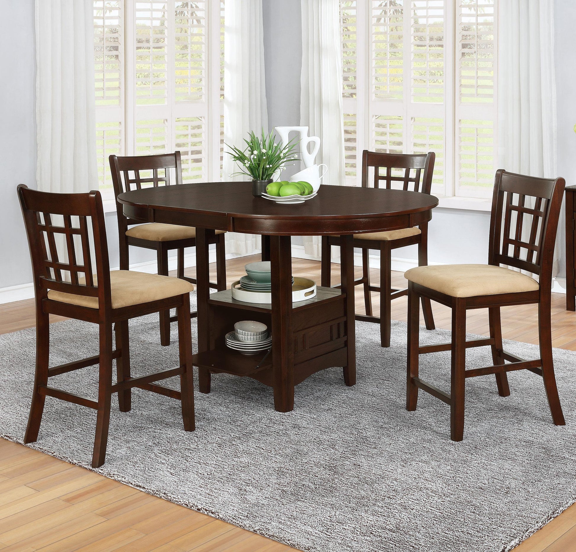 Meet the Lavon 5-piece Counter Height Dining Room Set, designed for compact spaces with everyday style. The warm brown and tan finish adds warmth and versatility to kitchens, dining nooks, or small dining rooms.