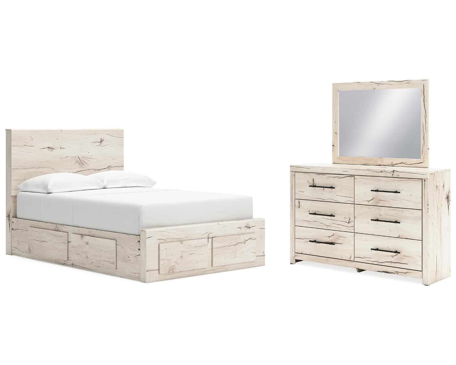 Lawroy Full Panel Storage Bed, Dresser and Mirror — Light Natural