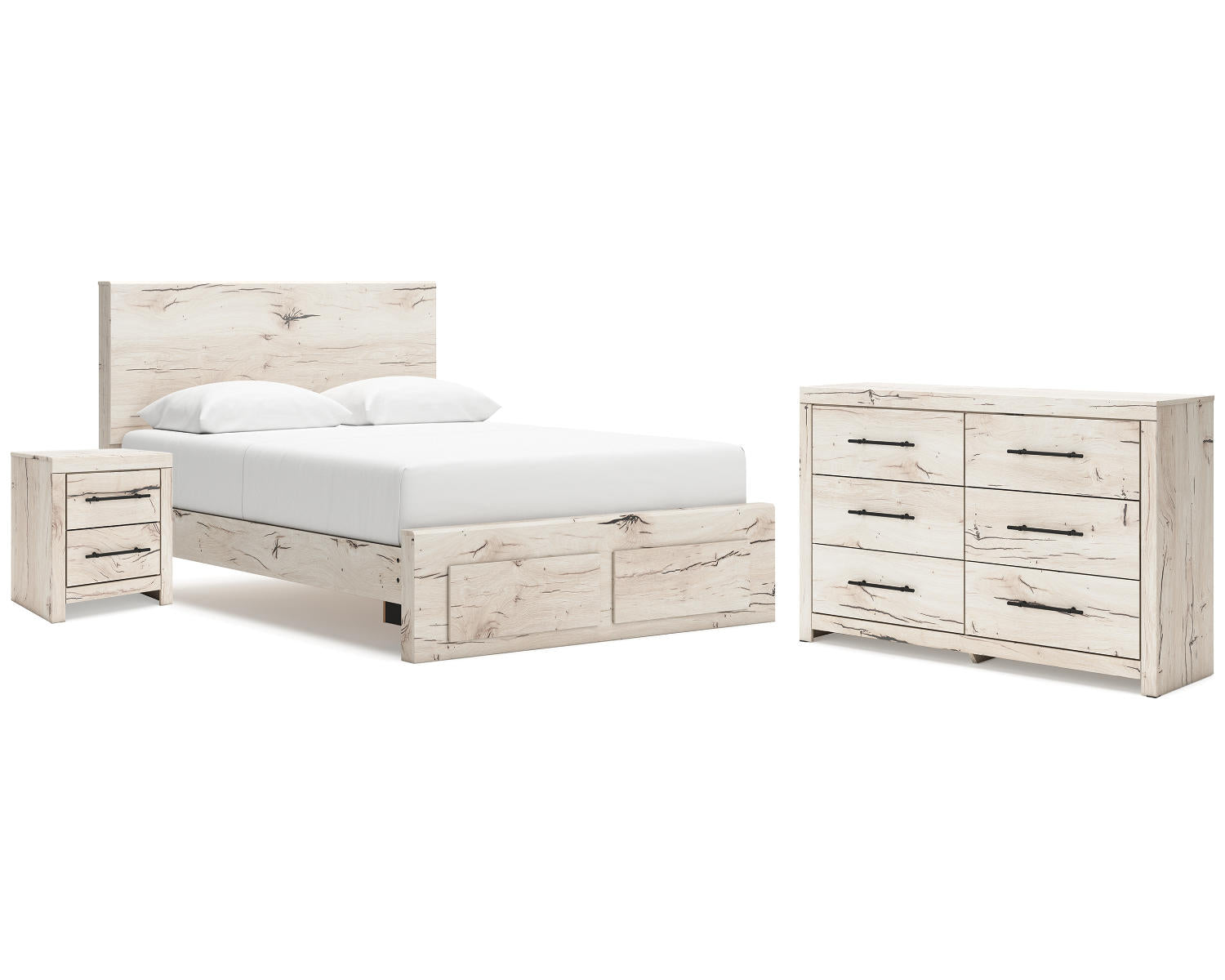 Lawroy Queen Storage Bed, Dresser and Nightstand — Light Natural