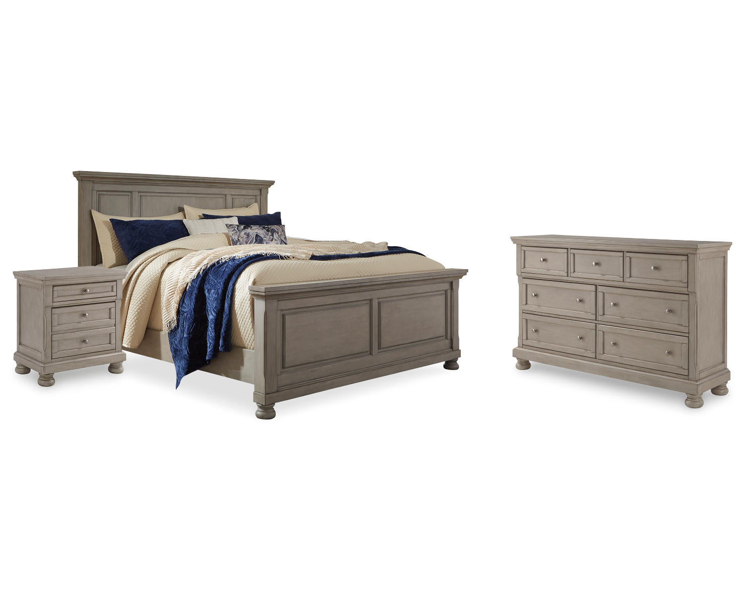 Lettner Queen Panel Bed, Dresser, and Nightstand – Light Gray